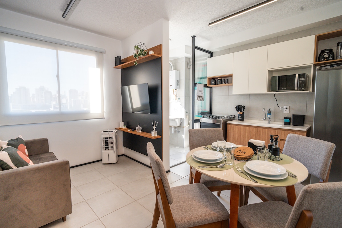 Goditi una vista mozzafiato sul Memoriale Latinoamericano. Monolocale moderno e ben attrezzato in un nuovo edificio con palestra, spazio gourmet, lavanderia, minimarket e terrazza sul tetto con doccia e specchio d'acqua per rinfrescarsi. Ideale per soggiorni brevi o lunghi, con Wi-Fi da 600 mbs, Smart TV, aria condizionata, cucina completa (friggitrice ad aria, macchina del caffè, forno a microonde) e comodo spazio per l'ufficio. Include un corredo completo. A soli 5 minuti dalla stazione di Barra Funda e a 10 minuti dall'Allianz Park.