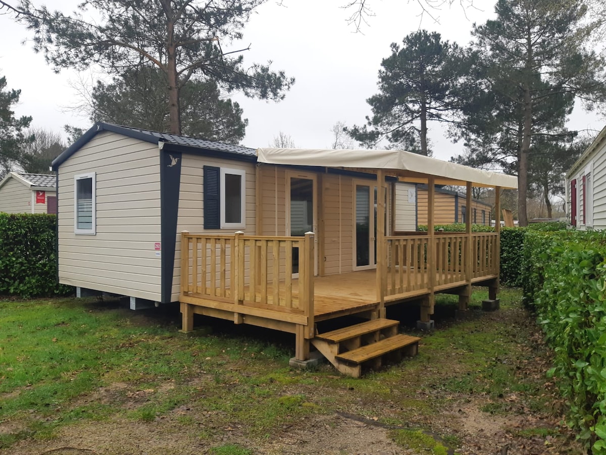 Soggiornate al Domaine de Kerlann, campeggio di lusso **** a Pont-Aven, in una confortevole mobil home per 6 persone. È composto da 2 camere da letto, soggiorno con divano letto, cucina attrezzata, bagno con doccia e servizi igienici. Godetevi l'ampia terrazza coperta per i pasti e il relax. Il campeggio dispone di un parco acquatico e il mare si trova nelle vicinanze. Ideale per una vacanza in famiglia o con gli amici in un ambiente a 4 stelle. Prenota subito per vivere momenti indimenticabili!