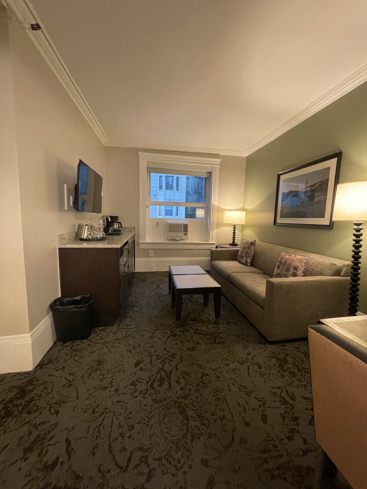 Questa suite unica vicino a Union Square e alla funivia, questa suite dell'hotel offre la quintessenza dell'esperienza di San Francisco. La tua camera al Donatello è ben attrezzata per esplorare la città con un letto king size e un bagno completo. La sala di allenamento significa che non devi lasciare la tua routine quando sei lontano da casa e il WiFi è incluso. Questa è una spaziosa suite di hotel (~400 piedi quadrati) in una grande area di San Francisco.