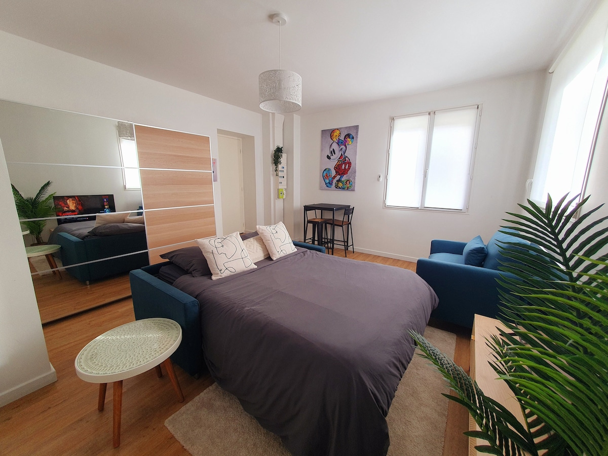 Vi diamo il benvenuto nel nostro monolocale annesso indipendente, uno chalet recentemente ristrutturato e isolato, nel cuore del nostro giardino, all'ombra di una grande quercia. Situato nel comune di Disneyland, a Coupvray, in una zona residenziale, a 800 metri dalla stazione di Esbly che permette di andare tra gli altri: - a Disneyland Paris in autobus (linea 2261 e linea 2262 della compagnia Transdev, linea N141 della SNCF) in 20 minuti - a Parigi (Gare de l'Est) con il treno Transilien linea P in 30 minuti.
