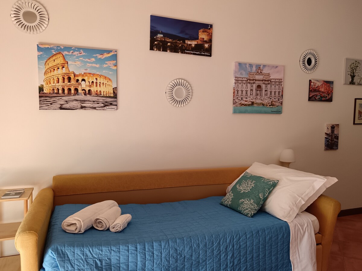 A metà strada tra il centro della città ed il mare, l'appartamento di 40 mq è situato al piano terra rialzato di un condominio, in un quartiere di Roma molto tranquillo e silenzioso. Ottima base di appoggio per visitare Roma, il mare ed Ostia Antica, a pochi minuti a piedi dalla fermata della metro. L'appartamento è composto da un soggiorno con angolo cottura, una camera da letto e bagno con doccia. Due biciclette a disposizione per gli ospiti.
