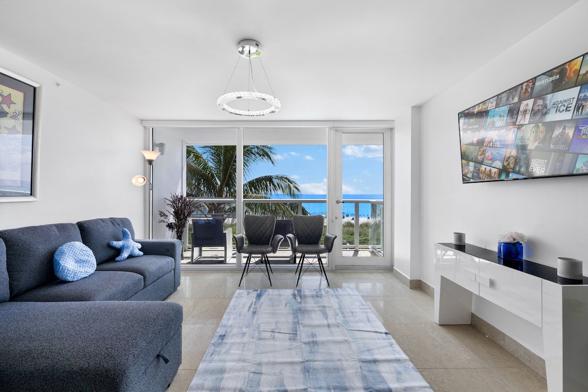 South of Fifth! Posizione privilegiata a SoBe, a 7 minuti dalla spiaggia. La nostra luminosa unità d'angolo al 2° piano in un edificio con ascensore può ospitare 4 persone con una camera da letto privata con letto queen-size con tende oscuranti + letto a scomparsa di dimensioni standard. Goditi la luce naturale, il balcone, la cucina completa, la lavatrice/asciugatrice, la smart TV da 65" e il wifi veloce. Edificio in stile Art Déco con piscina riscaldata, barbecue e cortile lussureggiante in un isolato tranquillo, ma raggiungibile a piedi da Ocean Dr., Lincoln Rd., negozi, parchi e vita notturna. Non serve l'auto! È possibile noleggiare attrezzature per bambini.