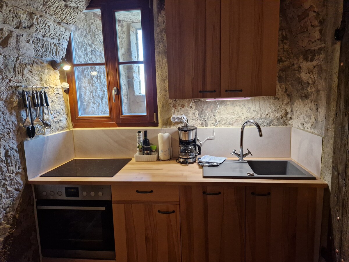 Godetevi un piacevole soggiorno in una posizione tranquilla per fare escursioni a piedi, in bicicletta, lavorare o semplicemente rilassarvi. L'appartamento dispone di un proprio ingresso e di una terrazza. La cucina a vista completamente attrezzata (forno, microonde, macchina per il caffè) offre spazio per una famiglia o un massimo di quattro persone con un grande tavolo da pranzo e un posto letto aggiuntivo. Il soggiorno è arredato come una stanza di passaggio per la doccia e il WC con scrivania e un altro divano letto.