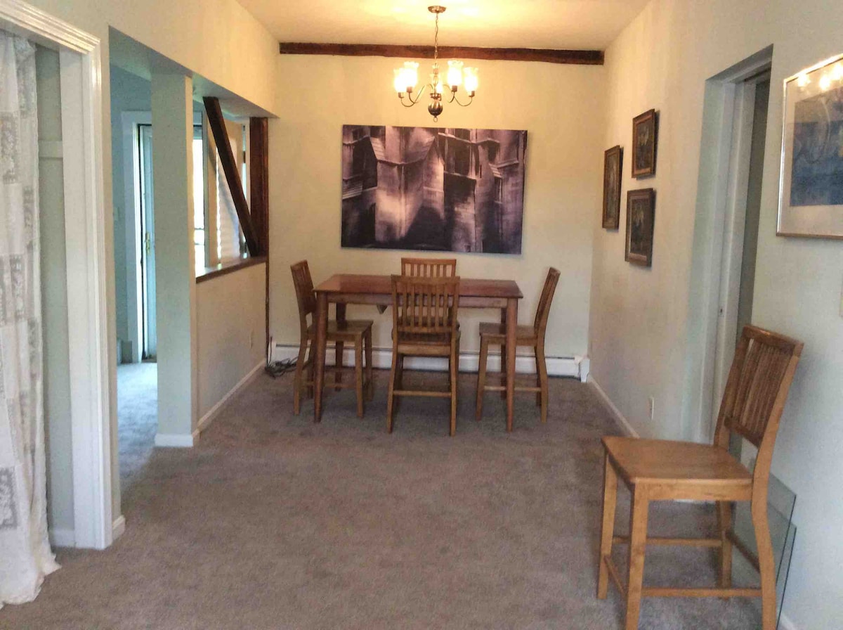 Keep it simple at this peaceful, centrally-located efficiency apartment above our garage. 15 minutes to Gardiner/Augusta, 15 minutes to I95/295. Less than one hour from Portland. Sit by the stream, listen to the loons or enjoy relaxing in the hot tub. If you want to kayak, you can do that too! Eagles regularly soar overhead. Queen size bed, love seat and room enough for a pack and play. A/C, full kitchen, Keurig, microwave, toaster, dishes. Wifi and cable. Roomy parking.
