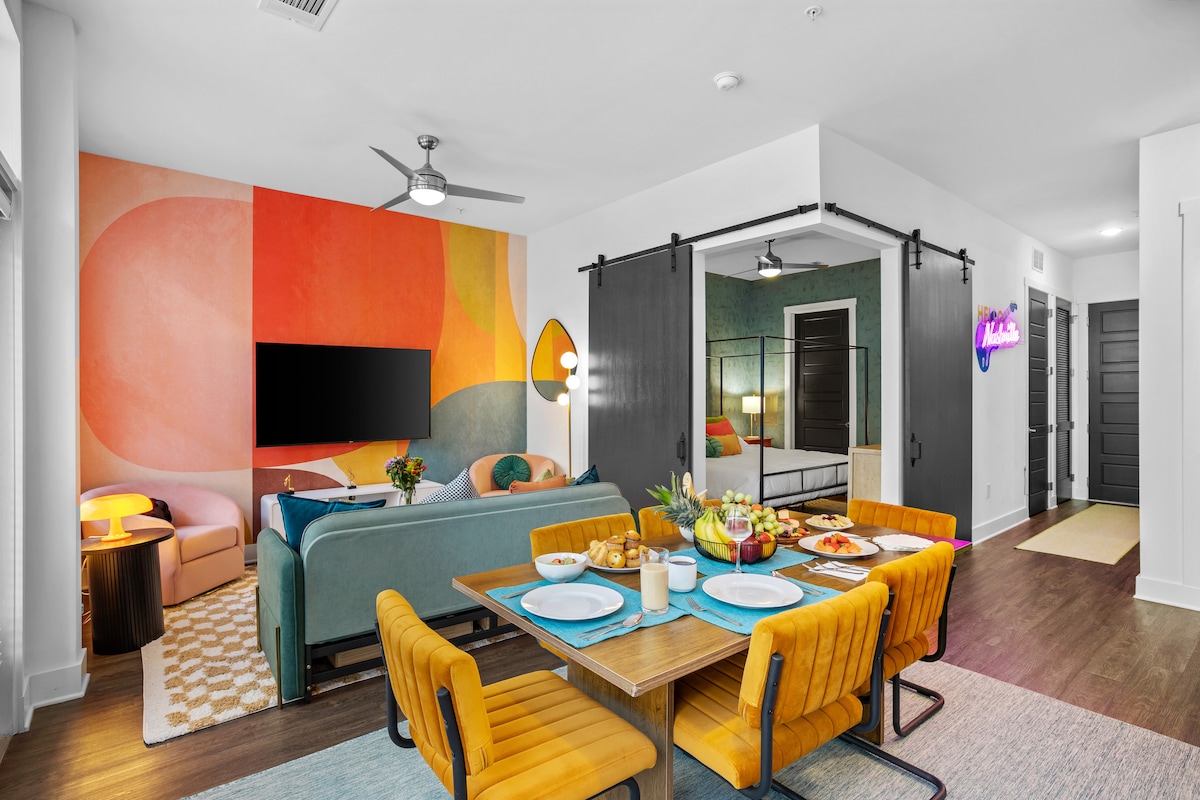 Ti diamo il benvenuto al Bluebird & Barrels, un rifugio sexy progettato dalla stessa Megan Soto di Nashville! Questo appartamento in centro è dotato di piscina, sala fitness e garage recintato (con posto assegnato!). Trascorri la giornata esplorando molti dei famosi ristoranti, punti caldi, caffetterie e bar a pochi passi. Poi torna in un paradiso moderno dove il divertimento continua! Goditi un drink sul balcone o siediti e goditi la cena con vista. Questo appartamento perfetto con 1 camera da letto + camera a castello può ospitare 6 persone.