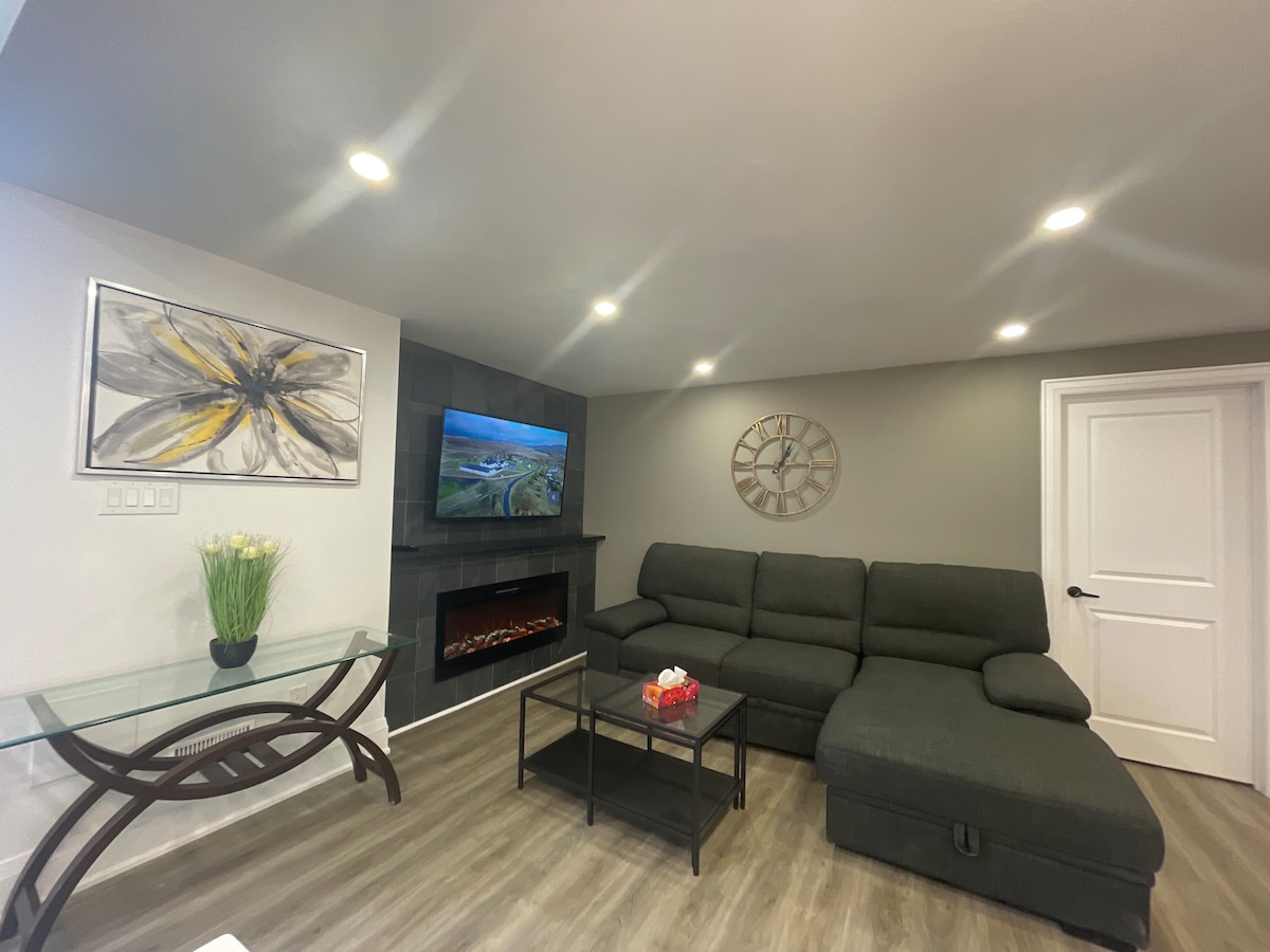 Ampia camera da letto (circa 820 SQ Feet ) Pulito, unità non fumatori con due TV da 65 pollici, Lo spazio è privato e solo per gli ospiti che lo hanno prenotato. Il parcheggio è disponibile, se necessario A 5 minuti dalla 401, dal Toronto Premium Outlet e dalla stazione di Milton. Un parco si trova proprio di fronte. Negozio di alimentari RABA 24*7 e L'accesso avviene tramite garage utilizzando il tastierino.