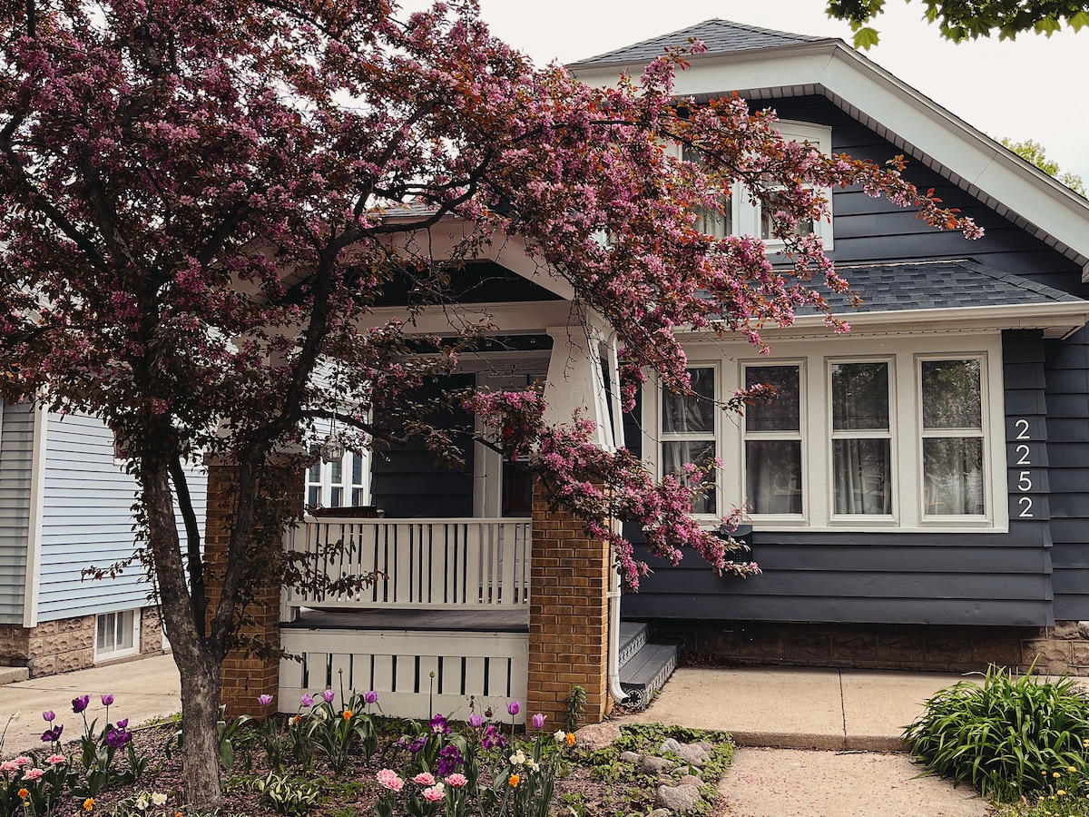 Welcome to our 1924 Craftsman Bungalow! Marrying Prairie House style with the innovations of the Chicago Craftsman, our brick bungalow is awaiting your stay. You'll enjoy the upper suite, with private entrance, two bedrooms, kitchen, and full bath. Newly redone porcelain marbled floors inspire luxury with each step, along with the new 'Article' sectional, 50" TV with streaming, 100% Cotton bedding and towels, a kitchen full of perks and appliances, and lush greenery to keep the air clean.