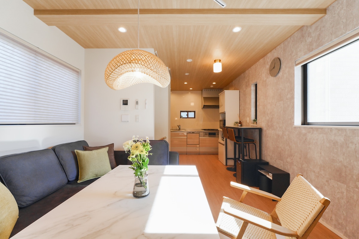 Scopri una miscela unica di design scandinavo e giapponese in questa casa a due piani ristrutturata di 86 anni a Sangenjaya. Con 80 m² di spazio luminoso, un soffitto di 3 metri e uno spettacolare soffitto di 7 metri sopra la cucina, è perfetto per famiglie e piccoli gruppi. A soli 6 minuti dalla stazione e a 4 minuti da Shibuya, la casa offre il mix perfetto di tranquillità e praticità cittadina in uno dei quartieri più amati di Tokyo, Sangenjaya.