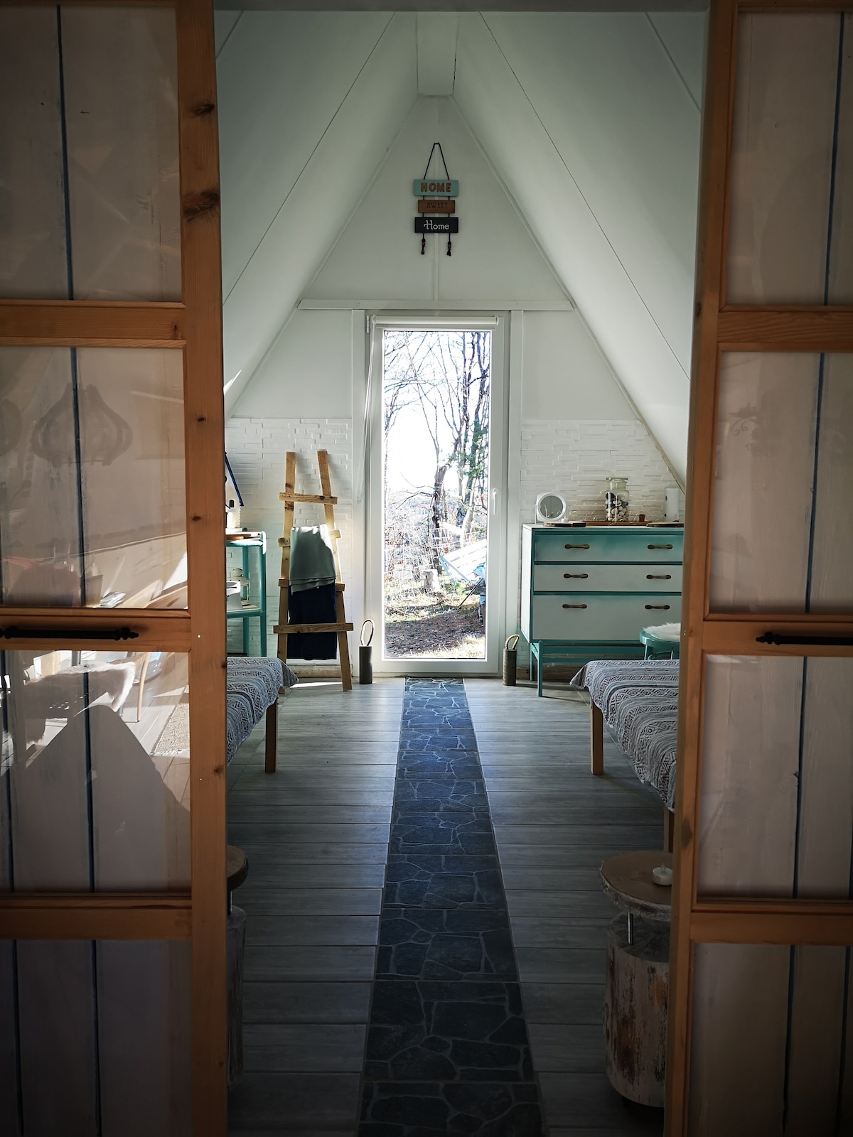 Ti diamo il benvenuto nella nostra pensione, uno spazio semplice ma invitante nella nostra proprietà di famiglia. All'interno, troverai un bagno ben illuminato con doccia a pioggia, TV e internet. Una macchina per il caffè, un frigorifero e un comodo divano rendono la zona soggiorno ideale per il relax. Uno spazio sopraelevato contiene due materassi, uno per dormire, l'altro per rilassarsi, che si trasformano in letti per gruppi di quattro persone. All'esterno, goditi un posto a un tavolo situato davanti a una collina di piante amanti del sole. Su richiesta non è disponibile una cucina, ma i pasti fatti in casa sono disponibili.