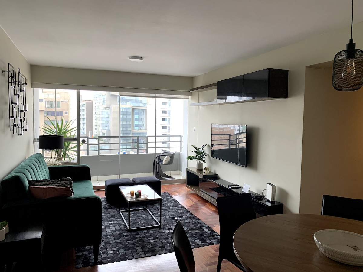 ★LUSSO ★ POSIZIONE PRIVILEGIATA★ - A 3 isolati dal centro commerciale Larcomar e dalla passeggiata sulla scogliera - A 7 isolati dal Parco Kennedy - Vicino al quartiere bohémien di Barranco (10 minuti di auto) - A 3 isolati dal JW Marriott e a 4 dall'Hilton - A pochi passi dai migliori ristoranti e bar! - Quartiere molto sicuro e tranquillo PUNTI FORTI: - Un sacco di spazio (1130 piedi quadrati/105 m²) - Balcone - Recentemente ristrutturato in stile lussuoso - Portiere 24 ore su 24 - Parcheggio per 2 auto - Cucina completa + lavatrice + asciugatrice + ferro da stiro - Wifi, 3 Smart TV da 49" e canali via cavo (+100) - Biancheria da letto e asciugamani inclusi