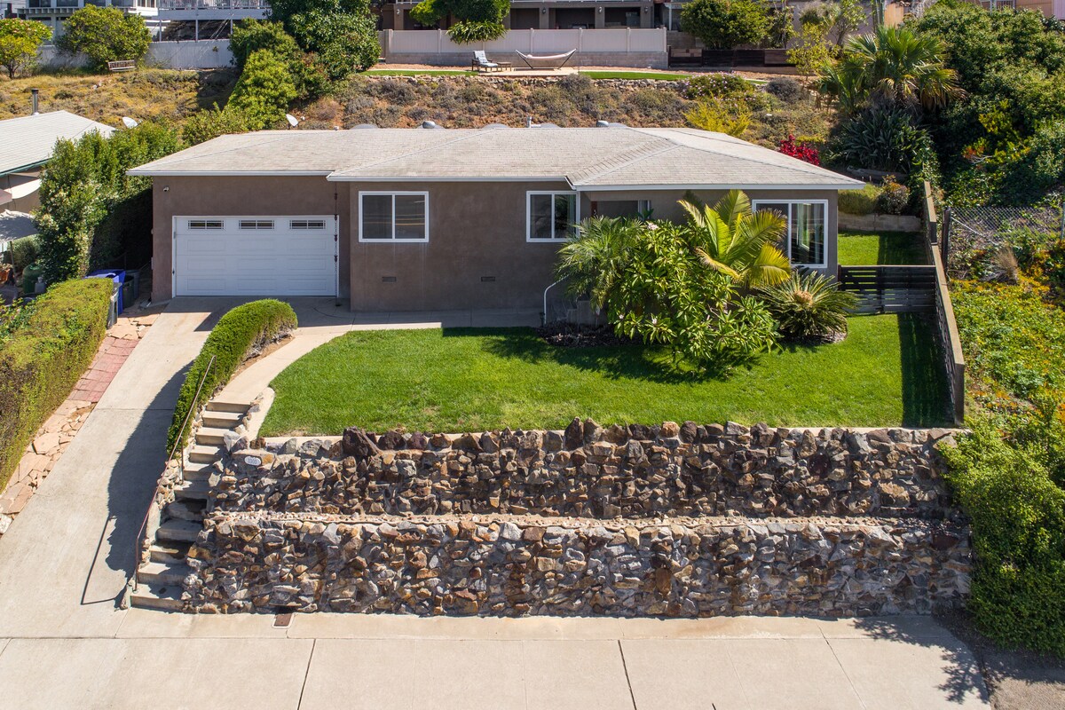 Fully remodeled home with sit down views of mission bay from the living room. Large covered, very private back patio with sofas, BBQ, flat screen TV stereo & space heater. Two flat screen TVs with surround sound wifi and DirectTV. Lots of free parking. 10 min or less to downtown, Zoo, airport, little Italy, PB, La Jolla, beaches. Walking distance to two trolley stops that go to great spots all around San Diego.