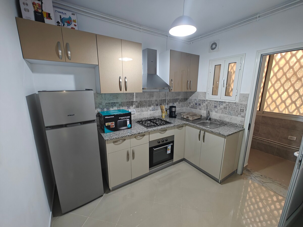 appartamento di alto standing arredato a El Manar 1 Tunisi, di 120 m2 è composto da 2 camere da letto , un ampio salone , cucina attrezzata, bagno, TV, Parabola , wifi, spazio di lavoro, riscaldamento centralizzato, , aria condizionata, vicino al campus universitario e alla clinica el manar, marmo bianco