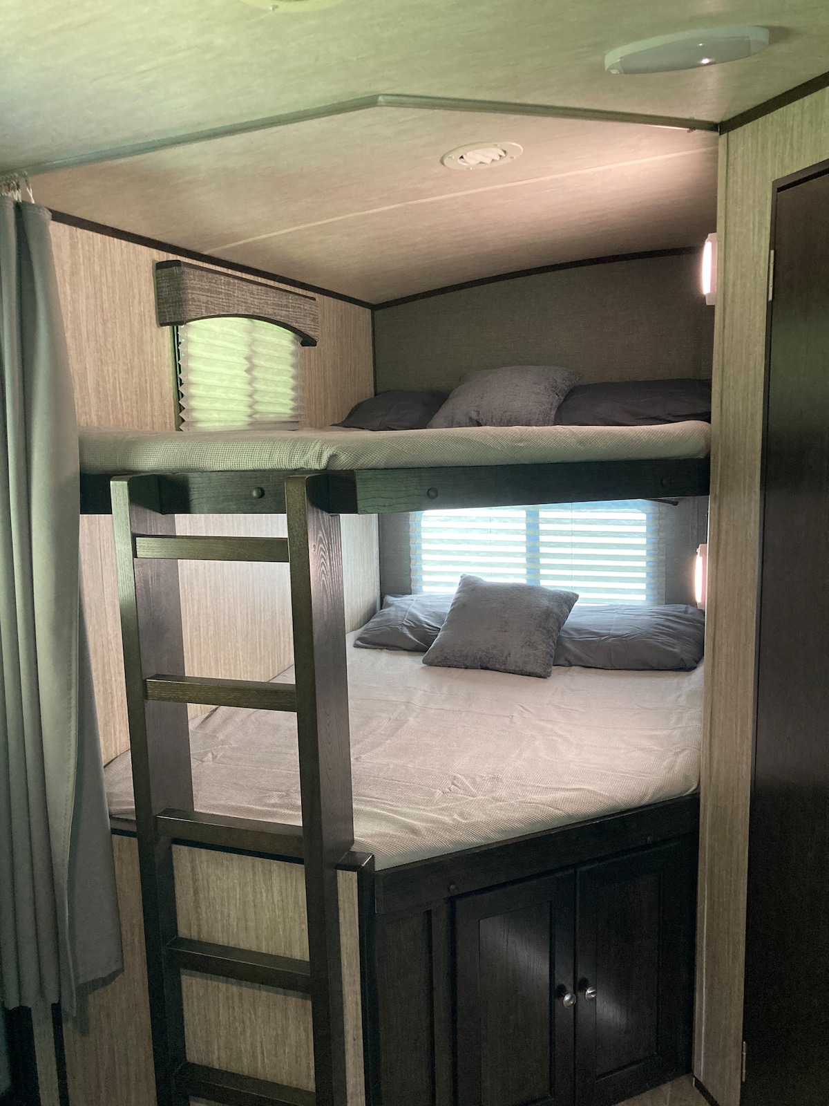 Il nostro camper Heartland Sundance da 27 piedi è predisposto per gli ospiti in un piccolo lotto nella parte anteriore della nostra fattoria. Gli ospiti potranno godere di una splendida vista sui nostri pascoli con la nostra piccola mandria di mucche e cavalli. Quest'area è predisposta per un'esperienza di glamping. Ciò include un focolare, sedie e una griglia all'aperto. Il camper dispone di 1 camera matrimoniale, 2 letti a castello, e anche il tavolo e il divano si trasformano in letti. Questo camper è 1 di 2 camper ora disponibili nella nostra fattoria.