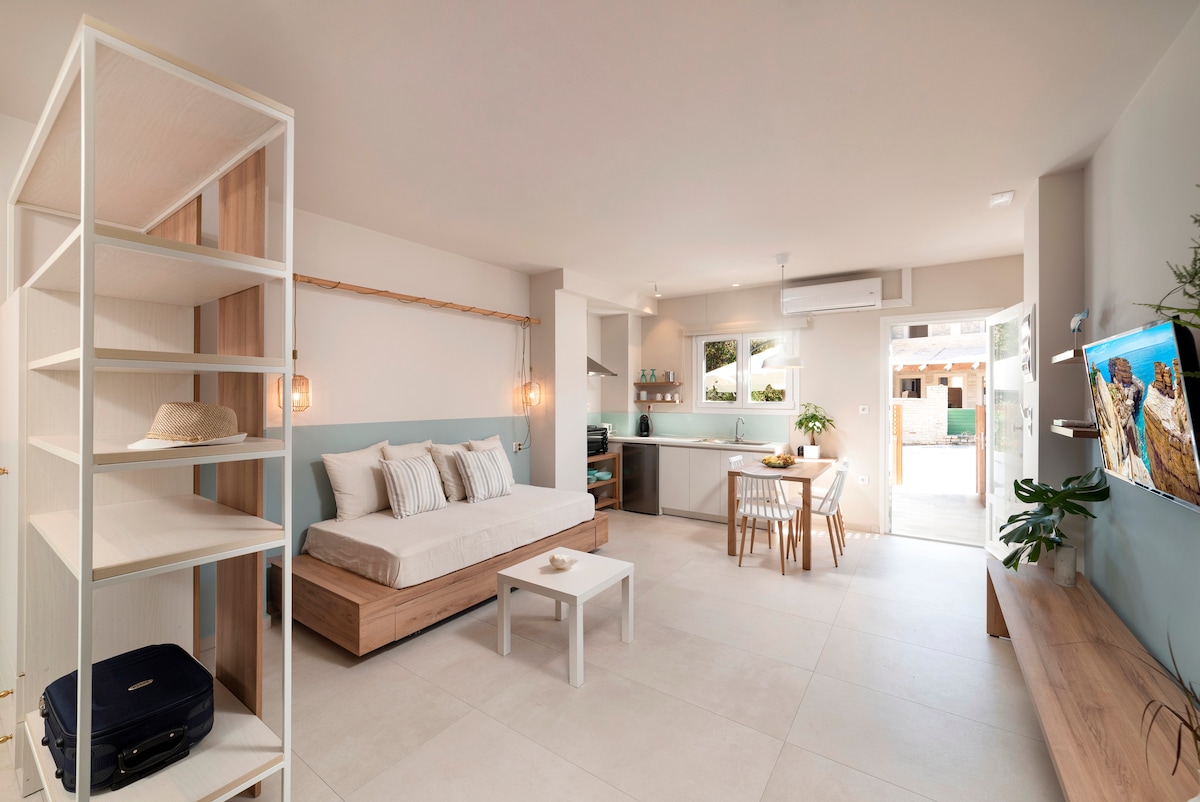 Sulla veranda aperta sopra il verde, rilassati di fronte al blu, senti il suono e la freschezza del mare. Goditi il tuo soggiorno negli interni tranquilli ed eleganti con tocchi di colore ispirati, oggetti di tradizione e arte locale insieme a tutti i comfort moderni. L'appartamento fa parte di un complesso di cinque case indipendenti all'interno di una proprietà ricca di flora locale, situata proprio di fronte alla spiaggia sabbiosa e al mare.