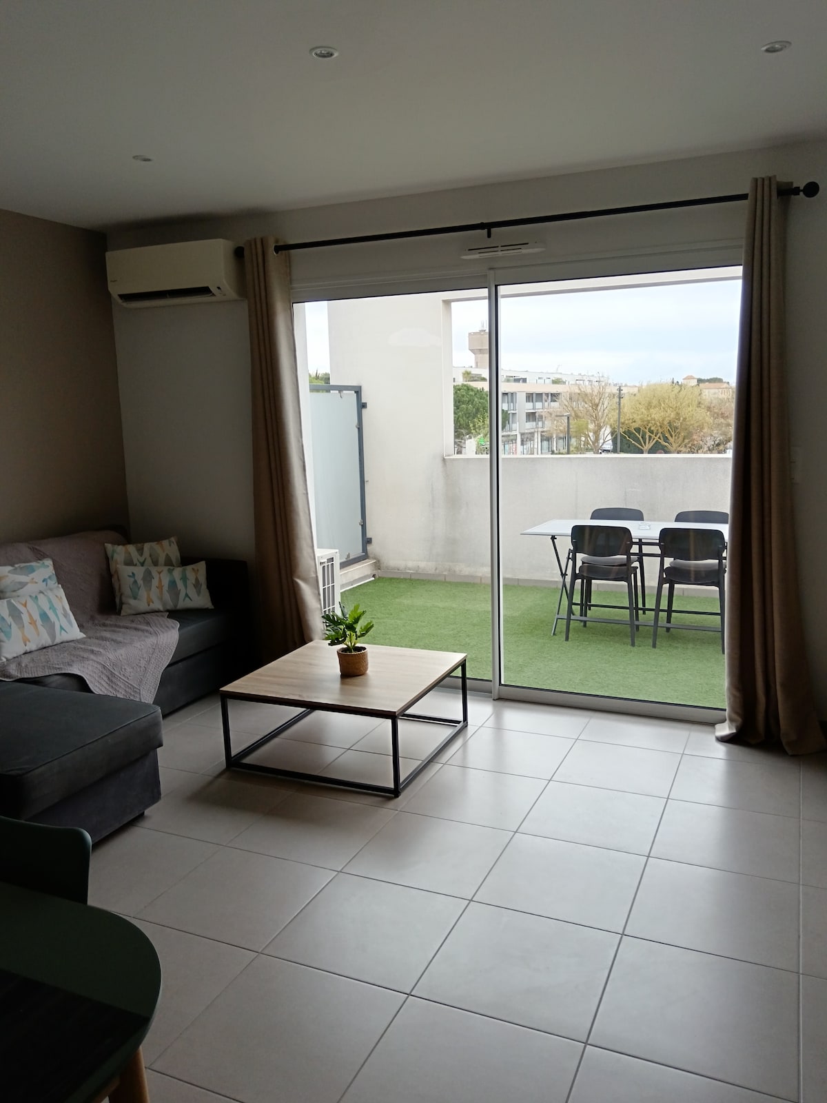 Simplifiez-vous la vie dans ce logement paisible et central. Au 1er étage d'une mini résidence, accès privé à l'appartement. A 200 m de la clinique Causse, du port de plaisance, du Canal du Midi et de l'hyper centre. Cuisine entièrement équipée, four à micro onde et lave-vaisselle. Chambre spacieuse, literie en 160 et placard. SdB avec fenêtre, wc independant avec fenêtre. Grande terrasse équipée, ensoleillée, vue panora Garage de 17 m2, parking privatif. Lave linge, étendoir et fer a repasser.