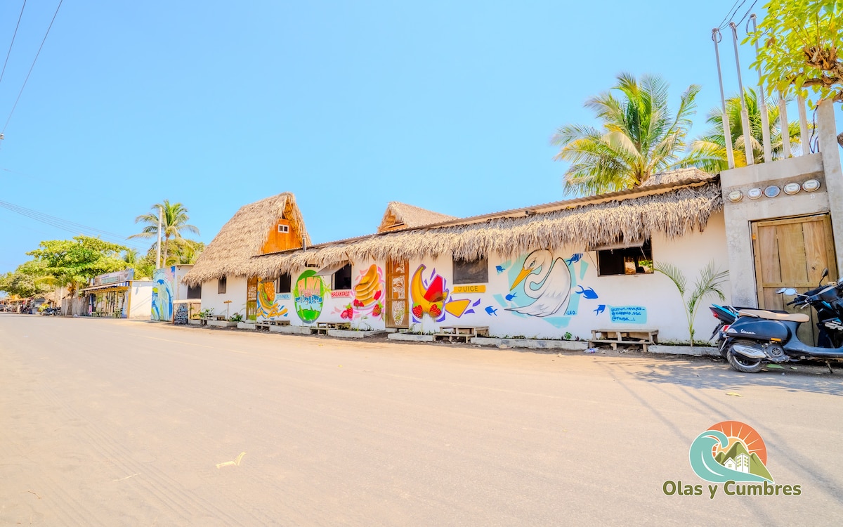 Welcome to Hidden Wave Resort! Best value on a beautiful beachside property in El Paredon. Your private Queen bed ranchito has air conditioning and lots of light with a great view of the garden. The washroom is shared. Our resort has a beautiful big pool, shared kitchen, garden, and surf board rentals. We are a 10 second walk from the beach (you can hear the waves) and we are in the best central location in town - walking distance to all the best restaurants and bars. You don't need a car.