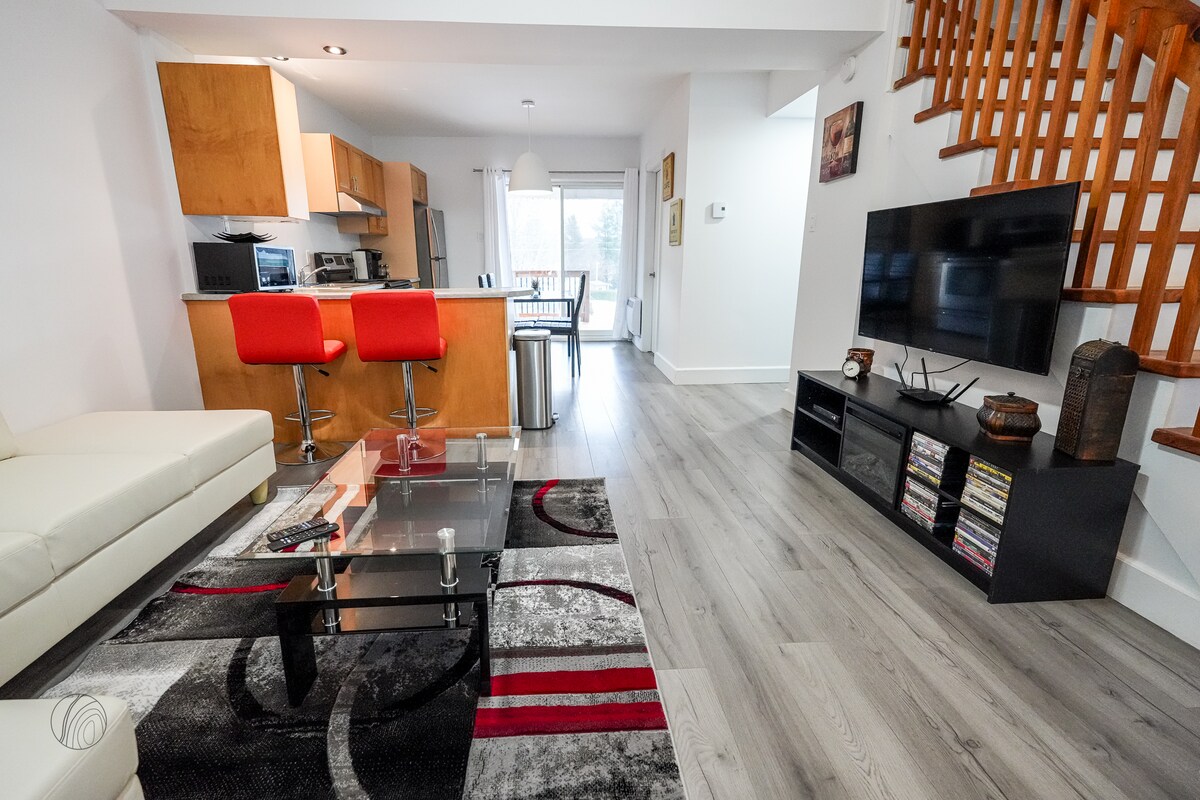 Sci in/out sul sentiero dell'altopiano, navetta per il villaggio, camino, pavimenti riscaldati e vasca idromassaggio! Ottimo per le vacanze tutto l'anno! Nel complesso del Plateau e a 10 minuti a piedi dal villaggio pedonale. Il complesso dispone di una pista di pattinaggio invernale e di una piscina stagionale. Posizione privata e tranquilla con la possibilità di fare escursioni e passeggiate nella natura. Caminetto vero, aria condizionata in soggiorno e vista mozzafiato dalla terrazza posteriore. Bus gratuito dal complesso residenziale al villaggio pedonale (l'orario varia). Appartamento tranquillo e accogliente.