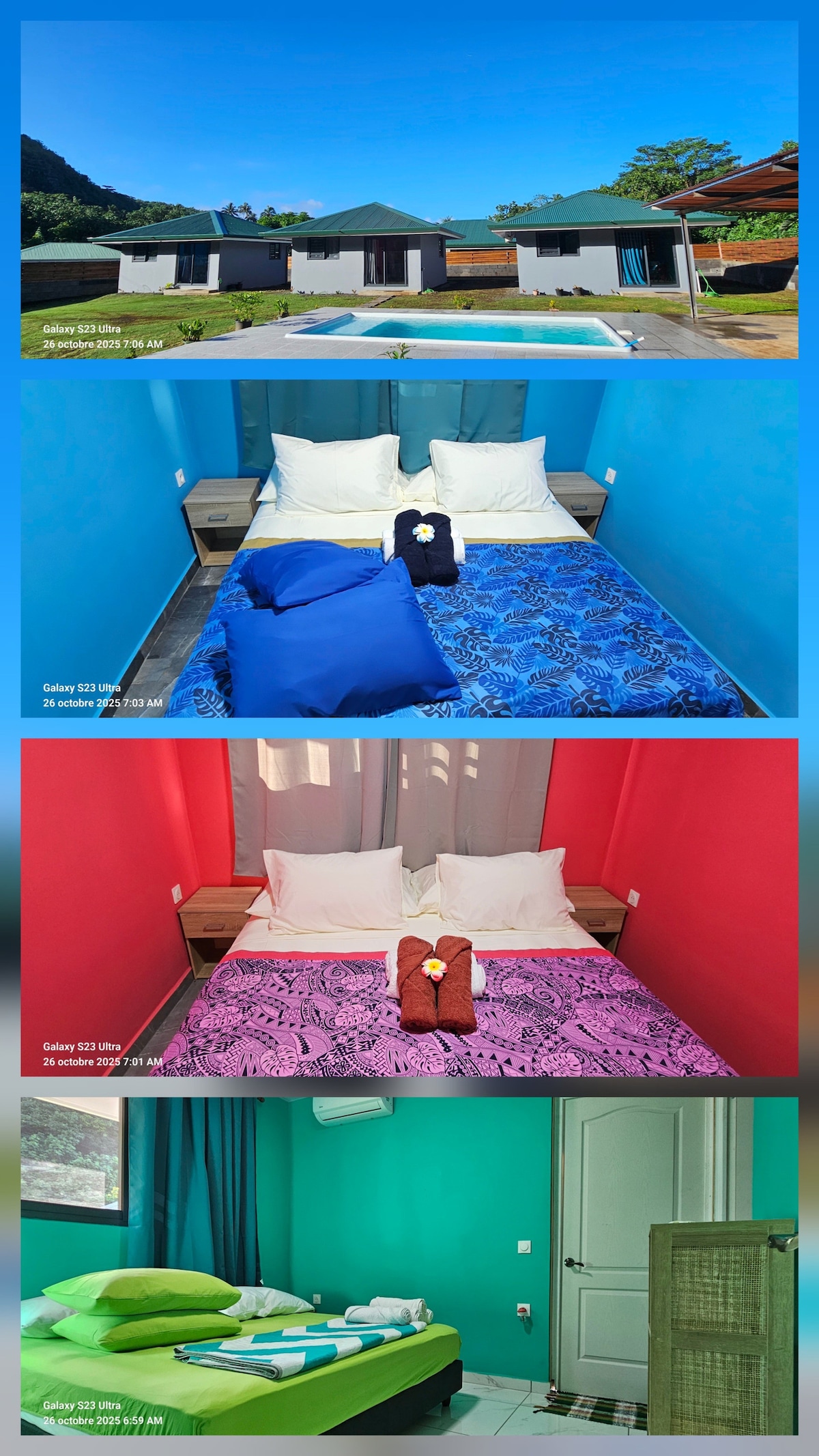 Notre maison chalet typique polynésienne a été rénovée. La maison comprends 2 chambres, vous dormirez sur des grands lits de 180x200. La chambre 1 vous offrira une vue imprenable sur la mer et la chambre 2 sur la montagne. Profitez d'un accès mer à 500m de la propriété. L'endroit est calme, vous serez charmés par le jardin d'arbres fruitiers et ses fleurs. Profitez de ce fabuleux logement qui offre de bons moments en perspective.