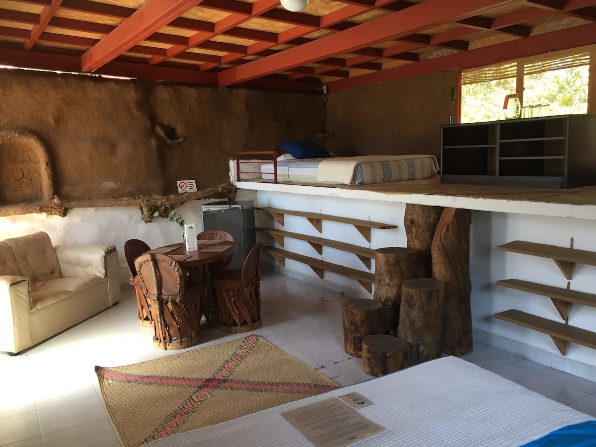 Construida con técnicas de tierra y uso de residuos, techo verde y baño seco, con terraza con vista al bosque y al atardecer. Ideal para descansar y aprender técnicas de bioconstrucción. Si ama la naturaleza y el cuidado del medio ambiente, es una habitación para tí. El WC (baño sec), consiste en taza separadora de orinan y excremento; no usa agua sino que aplicas una mezcla de aserrín y carbón. Para ver detalles de este sistema busca en internet "Baño Seco".