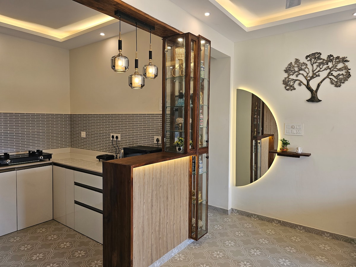 Meditazione, calma mentale e chiarezza sono stati il nostro obiettivo principale quando abbiamo creato questo bellissimo spazio. Costruito in stile esagonale, è uno spazio che immediatamente lenisce, calma e rinfresca tutto il corpo. Circondato su tutti i lati da vecchie vetrate in stile Goan che si affacciano sul giardino, questo spazio è l'ideale per ricaricarsi e ringiovanire. Ho anche allestito una scrivania. Ho progettato una cucina con giardino a pianta aperta in stile molto zen, con uno splendido boschetto di bambù come sfondo.