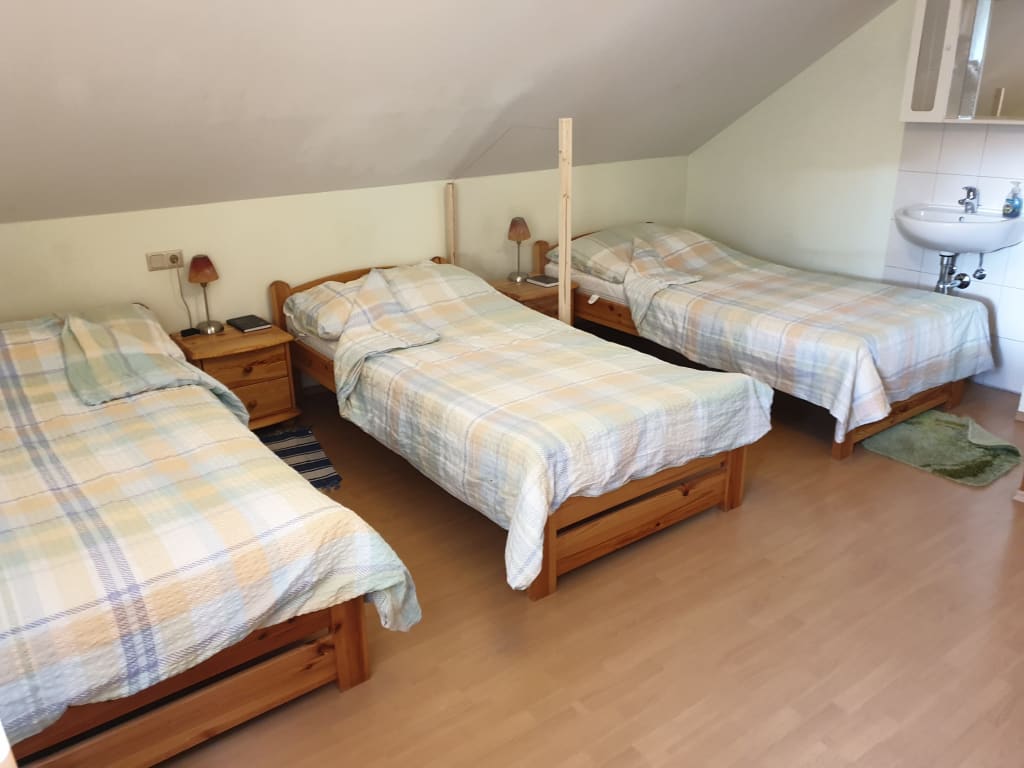 Forget your worries in this spacious and serene space. We created this space so that we can share it with you, to spend time in our homely designed rooms and enjoy the peace around nature in the large natural garden. There are 5 separate beds ( 1 double and 3 single) + a large sleeping Sofa in 2.5 seperate rooms. One room is 2 in one with a walk-through. We have a FULL KITCHEN with dining, microwave, fridge, dish washer &dishes etc. There is a grilling space outside if the weather is good.