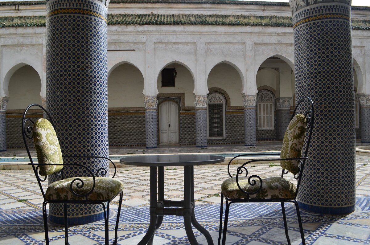 Un sontuoso palazzo arabo-moresco, costruito tra il 1890 e il 1906, nel cuore della medina di Fez. Questo gioiello architettonico ti immerge nell'eleganza e nella raffinatezza dell'epoca, offrendoti allo stesso tempo comfort moderni per un soggiorno indimenticabile. Situato a soli 10 minuti a piedi da Bab Boujloud (Porta Blu), è un punto di partenza ideale per scoprire i tesori della medina. Spazioso e autentico, un monumento ben conservato ricco di storia.