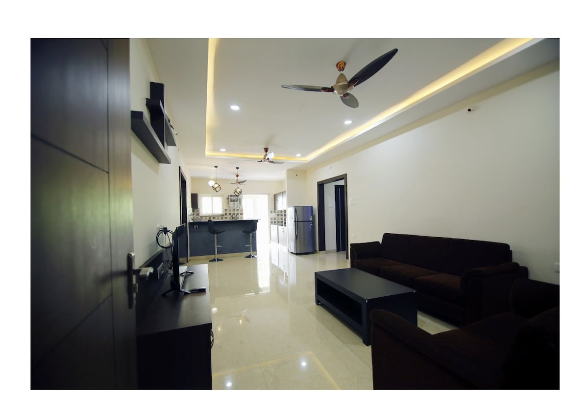 Ti diamo il benvenuto nel nostro elegante appartamento con 3 camere da letto, ideale per soggiorni brevi o lunghi. Goditi 3 camere da letto con aria condizionata e bagni annessi, un accogliente soggiorno con Smart TV da 43 pollici, Wi-Fi ad alta velocità e un'altalena interna. La cucina completamente attrezzata comprende fornelli a gas, forno a microonde, depuratore RO, frigorifero e utensili. Situato in posizione comoda vicino a Hitech City Metro, Usha Malpuri's Kitchen (100 m), US Visa Center (1 km), Cable Bridge e ai principali centri IT.
