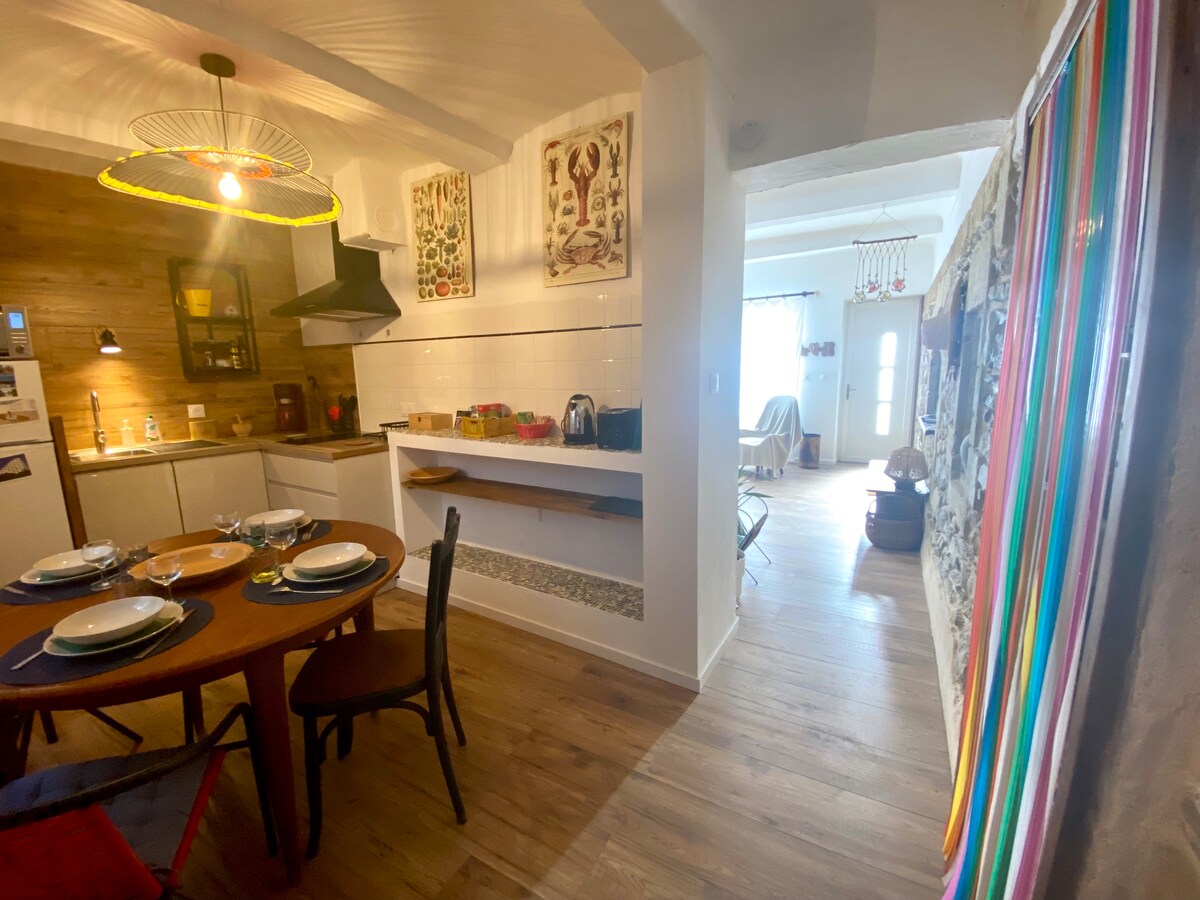 À 15 mn de la mer, dans un agréable village, calme, entre Nîmes et Montpellier. Maison de 60 m2 (2 chambres, salle de bain et cabinet de toilette, salon, cuisine avec courette. Déco contemporaine et cosy. Très joli pied à terre pour explorer notre région. Sur place, nous pouvons vous orienter ! Stationnement aisé, sûr et gratuit devant ou à proximité.