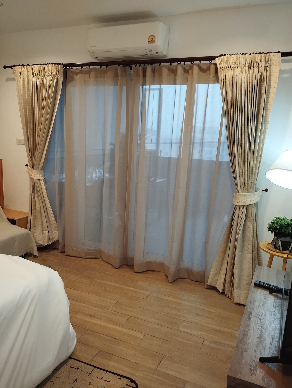 La camera è una camera da letto con una zona giorno, come frigorifero, aria condizionata, TV, forno a microonde, fornello per il riso, divano letto, TV, divano letto per guardare la TV, scaldabagno, lavandino, ferro da stiro a vapore, aspirapolvere, asciugacapelli, caldaia suki e frullatore alimentare, bancone di stoccaggio con ripiano, porta scarpe, espositore, scatola infiammabile, tende con partizione in vetro, set di piatti, coltelli e biancheria da letto, biancheria da letto, biancheria da letto, cuscini, coperte. Wi-Fi: sorawis Password: 12345678