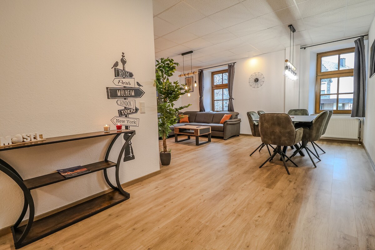 Il nostro moderno appartamento di 55 mq può ospitare 2 persone ed è situato in posizione centrale a Mülheim an der Mosel. In loco tutto è facilmente raggiungibile a piedi. L'appartamento è composto da: -un accogliente soggiorno - un angolo cottura completamente attrezzato. -varie macchine da caffè - forno a microonde e frigorifero con congelatore -una spaziosa zona pranzo e una camera da letto separata. Servizi igienici: - Doccia/WC - Asciugacapelli - Lavatrice. Il prezzo è comprensivo di lenzuola e asciugamani.