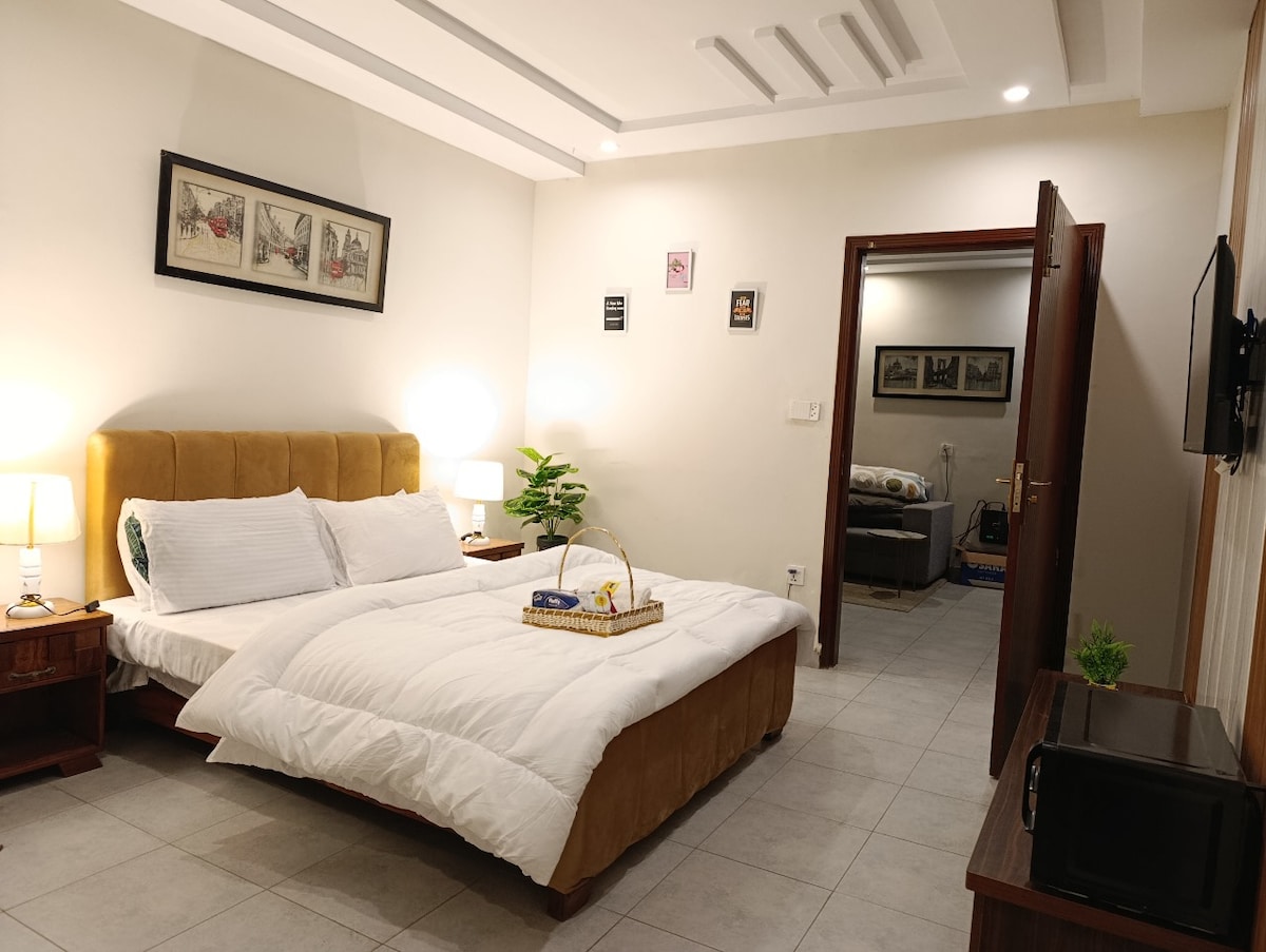 Perfetto per le famiglie! Goditi un accogliente appartamento con 2 camere da letto e un enorme balcone privato con vista ininterrotta sulle montagne. Completamente attrezzato con utensili da cucina, WiFi, Smart TV da 70 pollici, acqua calda, tavolo da pranzo e UPS. A soli 2 minuti a piedi da CBTL e dai ristoranti vicini e a 4 minuti a piedi da Monal & Asian Wok. McDonald's è a 5 minuti di auto. Un bar accanto all'edificio offre comodità come il servizio in camera. Facile accesso dall'autostrada Murree: il tuo tranquillo rifugio di montagna ti aspetta!