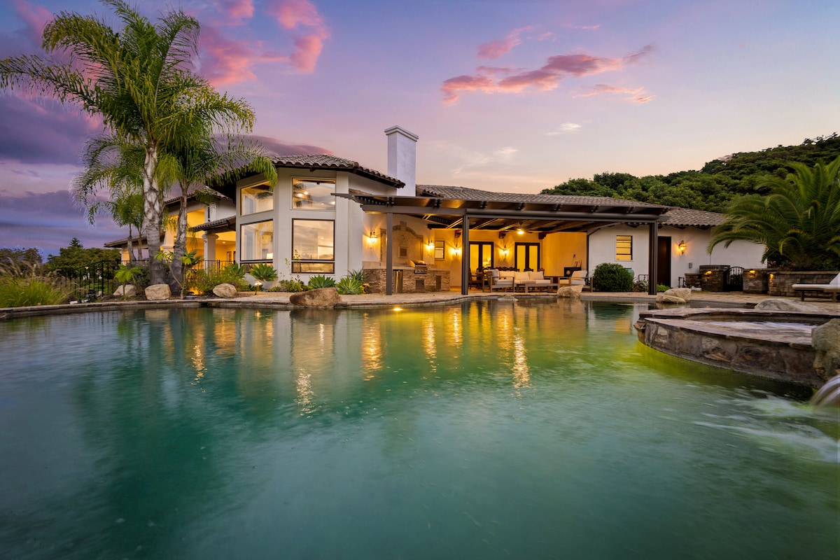 ** SCONTO DI 5 NOTTI A DIC-JAN ** Villa Toscana, un rifugio recintato di 2,4 acri a pochi minuti da oltre 40 acclamate cantine, Galway Downs, Old Town, Pechanga e campi da golf di prim'ordine. Tre lussuose suite con letto king size, ideali per più famiglie, si aprono su verande soleggiate, e due ali offrono ulteriore privacy. Goditi pasti gourmet, immergiti nella vasca idromassaggio, gioca nella sala giochi, mantieniti in forma e preparati nella suite nuziale. Wi-Fi ad alta velocità, opzioni per lo spazio di lavoro e caricabatterie per veicoli elettrici completano il tuo soggiorno. Prenota subito!