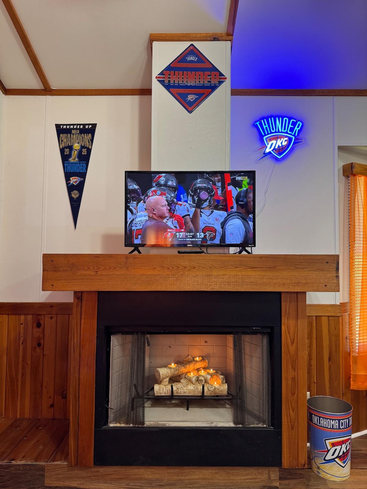 -Boat Parking & Plug -Smart TV -Stock Tank Pool -Hot Tub -Pet Friendly -Covered Deck -Near I-40 -Close to Marina -Tornado Shelter -Sleeper Sofa This log cabin is ready to host your next Lake Eufaula adventure. Our tiny home is equipped with a kitchenette. We do not have a traditional stove but have some great tiny home amenities for preparing meals alongside our outdoor charcoal grill. (Charcoal not provided).