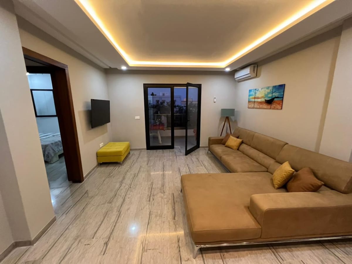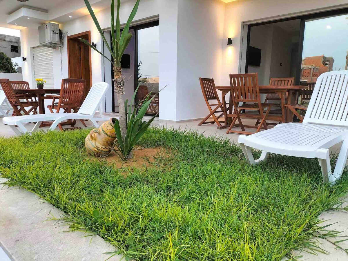 Questo alloggio tranquillo offre un soggiorno rilassante. L'alloggio si trova a due minuti in auto o a. 8 minuti a piedi dalla spiaggia el mansourah. Grazioso spazio esterno alla città, in un residence composto dalla villa del proprietario e da due appartamenti in affitto. una veranda con tenda per colazione all'esterno e in più parcheggio all'interno per auto . ps possibilità di ospitare 6 persone e un neonato .