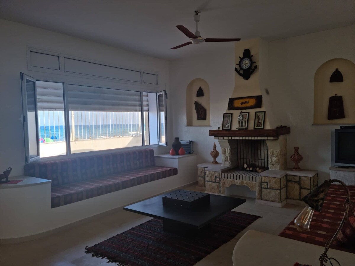 Grande maison, équipée de tout ce qui peut être utilisé ; sel, savon, détergents... un réfrigérateur. 2 tables (intérieur et extérieur), barbecue, canapé, meuble et télévision. grande terrasse avec vue sur la mer 2ème douche extérieure et lavabo. La maison est située dans une position stratégique à Tazarka(A 4min de la mer en voiture,10min a pied),très utile pour se déplacer dans les plus belles régions de Nabeul. La maison équipée de TOUT (situé au 3ème étage) L'accès est autorisé partout.