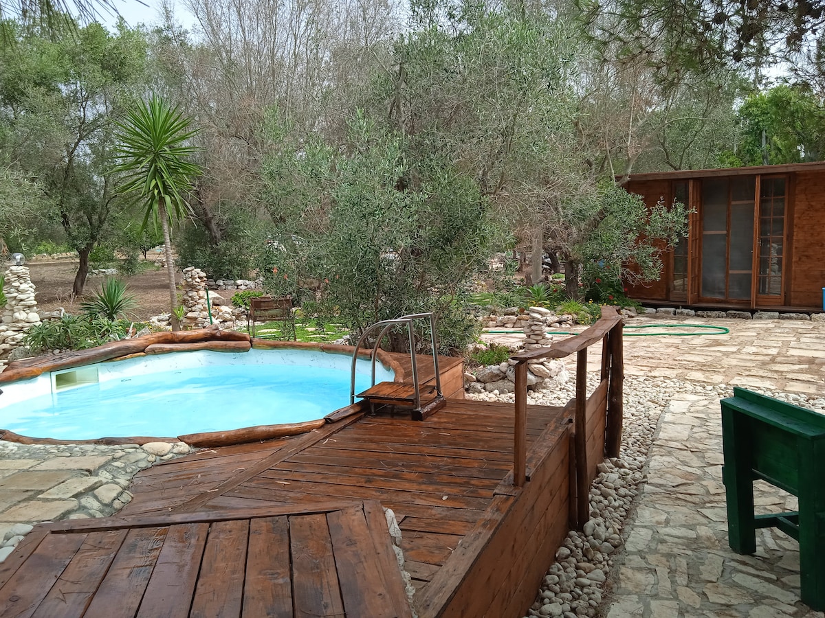 Baita in legno con piscina immersa tra bosco uliveto secolare e orti biologici a disposizione degli ospiti Ci sono letto matrimoniale un divano una cucina con aria condizionata.il bagno a ridosso della baita é situato all esterno ampio e confortevole All'esterno un area relax una doccia esterna un barbecue e piscina struttura ideale per i mesi estivi adiacente alla casa patronale ma é totalmente indipendente il mare dista poco meno 1 km in localita torre rinalda 9 km da lecce