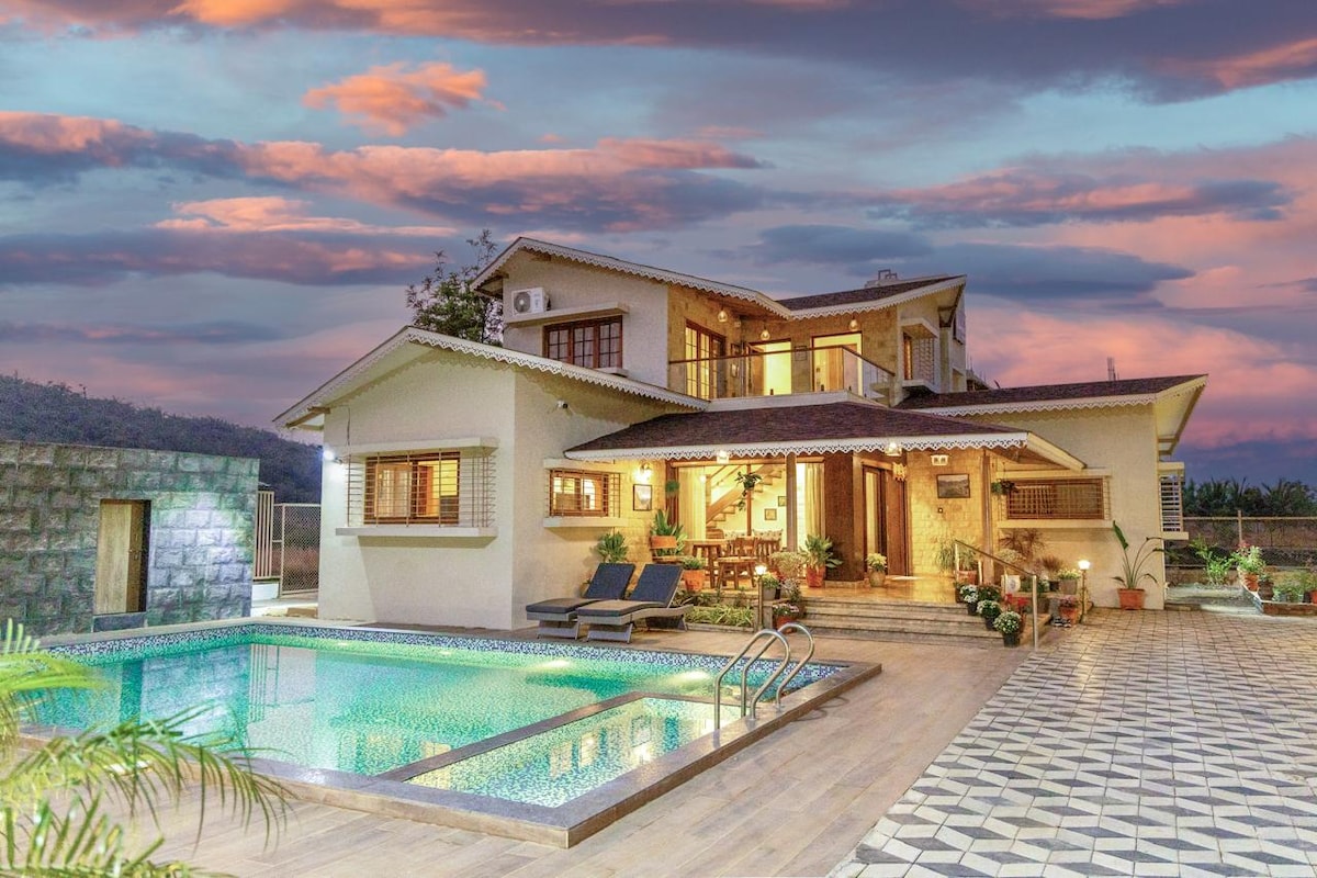 🏡 Villa con 4 camere da letto immersa nelle tranquille colline di Anjaneri, a soli 25 minuti da Nashik e a 2 ore e mezza da Mumbai - Può ospitare da 8 a 16+ persone, dispone di piscina privata e 4,5 bagni - Ampie aree soggiorno e relax con un accogliente mini bar - Cucina completamente attrezzata ed elegante sala da pranzo interna - Chef in loco disponibile (a pagamento) per deliziosi pasti o barbecue - Alloggio che accetta animali domestici🐕🐶 Perfetto per vacanze in famiglia, occasioni speciali o ritiri tranquilli vicino ai vigneti di Sula🍷e al tempio di Trimbakeshwar.🛕