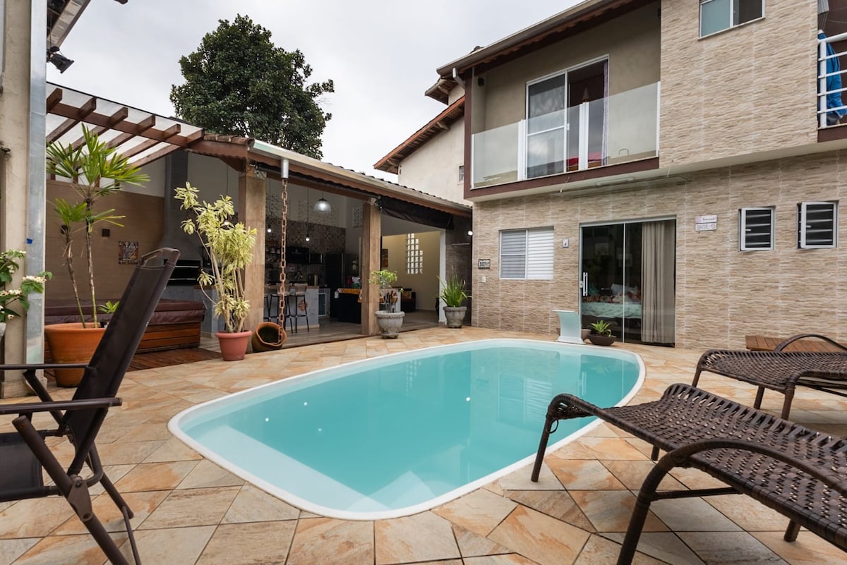 Siamo PET FRIENDLY! La casa si trova a 1 isolato (100 m) dalla bellissima spiaggia di Sape, all'interno di un condominio (vicino a Lagoinha). La casa dispone di 4 camere da letto (2 con bagno) + soppalco. Al piano terra ci sono 1 camera da letto e 1 bagno. Totale = 5 bagni Per il tempo libero c'è piscina, barbecue, forno per pizza, giardino con amache. Il condominio è facilmente raggiungibile vicino alla spiaggia (non è necessario attraversare la pista). Una volta arrivati, non avrete bisogno di un'auto, perché a 5 minuti a piedi ci sono supermercati, farmacie, negozi di alimentari, ecc. A 20 minuti a piedi ci sono delle cascate!