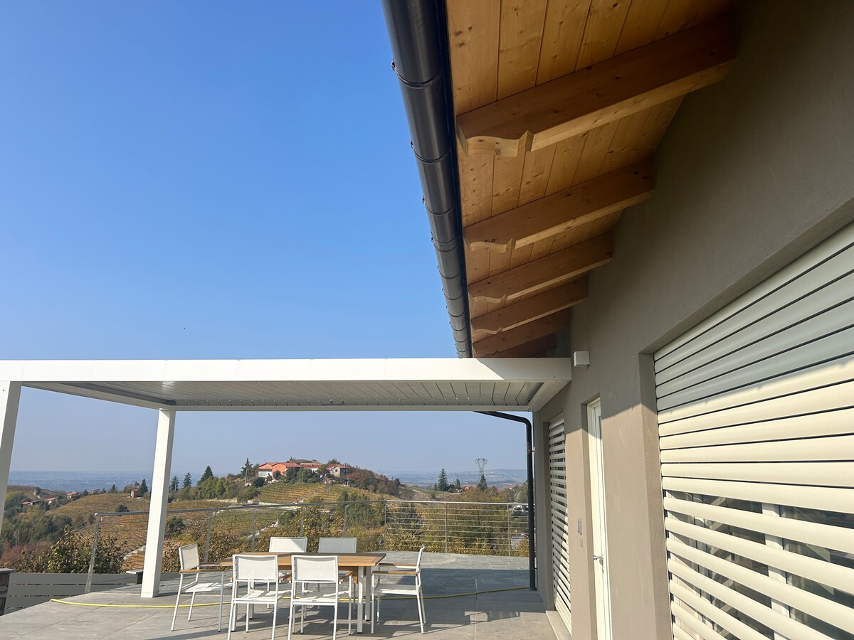 Semi-detached part of an ancient farmhouse with separate entrance, recently refurbished and fully equipped. No neighbouring houses. Two floors, two bedrooms, two bathrooms, each with walk-in rain shower, large living area, cozy dining corner, complete kitchen. Splendid view over the vineyards of Langhe-Roero, a UNESCO World Heritage Site with no overtourism. Close to Alba, Barolo and everything else you may visit while being in the area, including fine restaurants and famous wine producers.