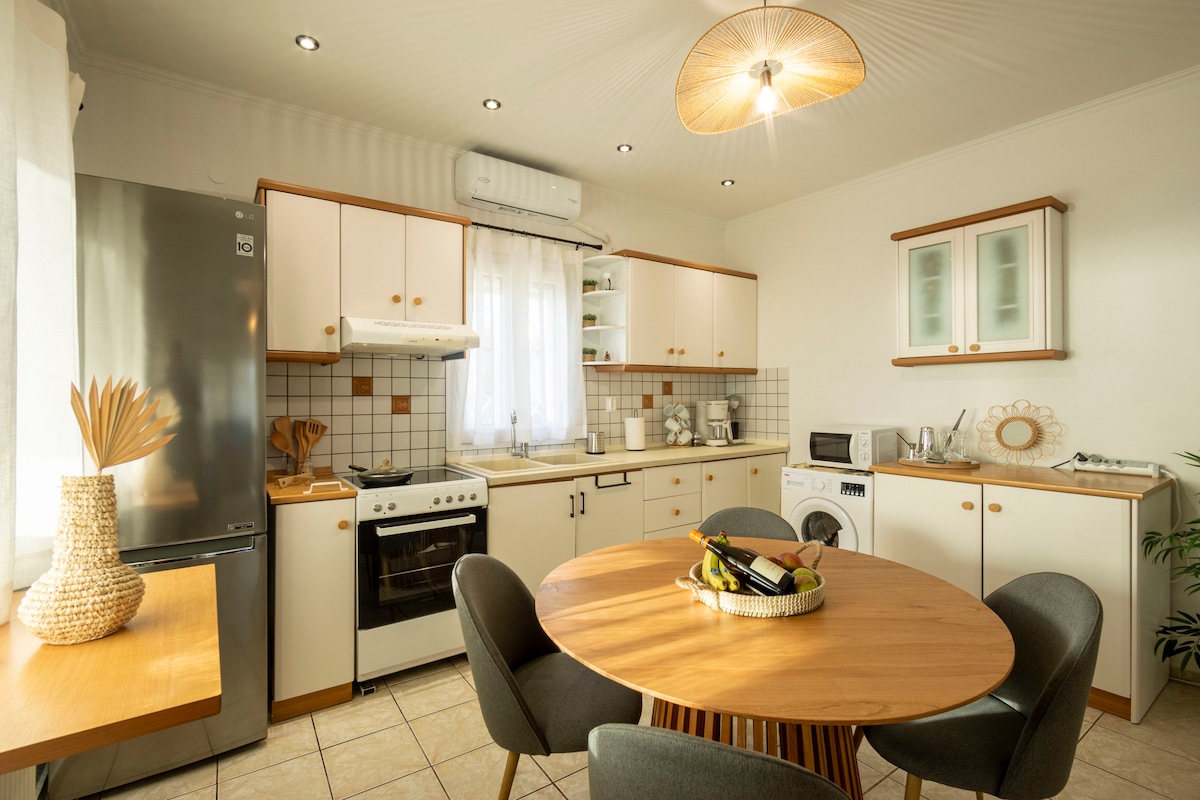 Il nostro appartamento unico è situato al secondo piano di una casa da sogno a Epanomi. Si trova a 3'di auto dalla spiaggia, in un quartiere tranquillo. Godrai della vista della montagna dell'Olimpo, del mare e del tramonto! Un letto super comodo, un accogliente divano letto per due persone, uno spazio dal design magnifico con vasca idromassaggio, un enorme balcone, un fantastico giardino con barbecue e un parcheggio sicuro sono alcuni dei servizi. Epanomi è molto vicina agli aeroporti di Salonicco e di Atene!