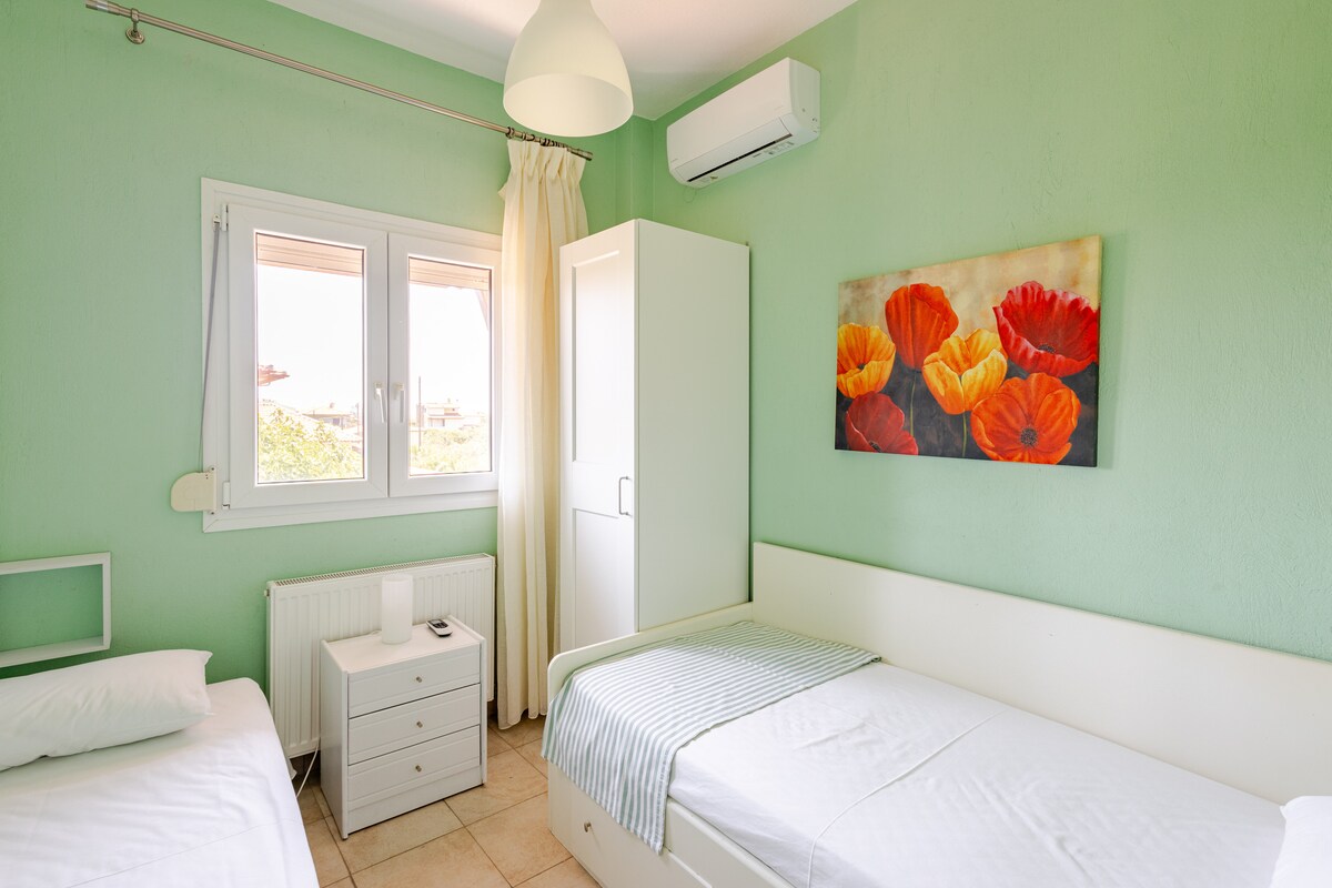 Uno splendido appartamento in cima, al 2° piano (solo tramite scale), situato proprio sull'acqua È confortevole, con un ampio balcone e una vista mozzafiato! Si trova nel centro della città, e la spiaggia è ideale per le famiglie che cercano una vacanza tranquilla. Supermercati, bar sulla spiaggia e taverne sono raggiungibili a piedi dall'appartamento. L'appartamento dispone di due camere da letto, un soggiorno con divano letto, una cucina completamente attrezzata, wc e doccia. A soli 20 minuti in auto dall'aeroporto e a 25 minuti da Salonicco!