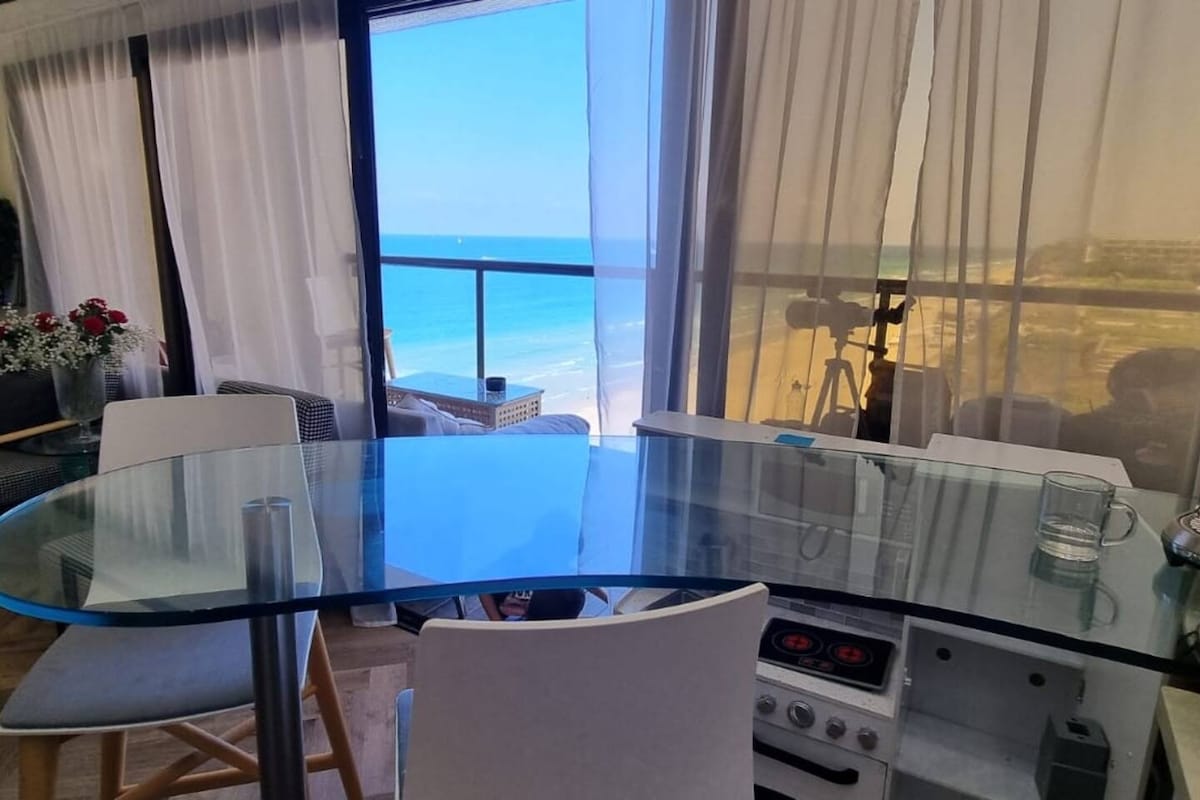 Un senso di libertà e brezza senza allontanarsi dal divano! Sulla ricercata via Gad Mansions, un appartamento di alta classe situato a metri da Haatsmaut Square e dalla spiaggia L'appartamento che è stato appena ristrutturato, gode di una splendida vista panoramica con un'enorme Vitrina nel soggiorno che ti fa sentire come se fossi sull'acqua. La struttura è stata progettata con cura per darti una sensazione di lusso e calore. La cucina è nuova e accessoriata con tutto ciò di cui potresti aver bisogno. L'appartamento dispone di 3 camere da letto in totale, con 7 letti, e circa 2 bagni completi con doccia e vasca. La posizione dell'edificio è sul lungomare e a pochi passi da ristoranti, café e intrattenimento nel centro città e sulla spiaggia.