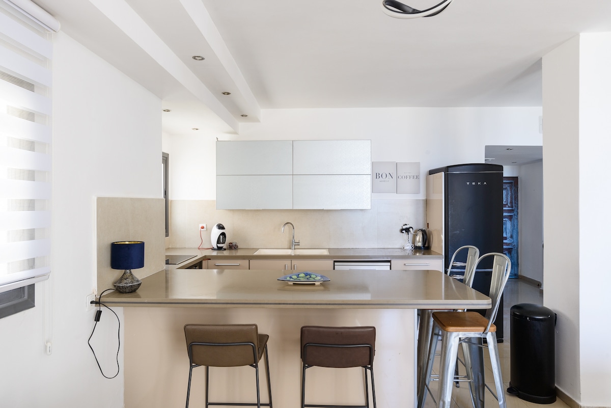 Rilassati in una suite tranquilla ed elegante di Herzliya Pituah in una villa lavata con verdure. Perfetto per chi viaggia da solo o per una coppia. La suite si trova al 1 ° piano (sopra K.K.) in una villa privata (a cui si accede da scale di design, ma ripide, non adatte a persone con disabilità. La suite è climatizzata e completamente arredata, include un soggiorno, una zona lavoro, una camera da letto per coccole, un angolo cottura completamente attrezzato e un bagno moderno. A pochi minuti dall'incantevole spiaggia e dal lungomare dell'Herzliya. A pochi minuti a piedi da supermercato, centro negozi, lavanderia, caffetterie e ristoranti, Medical Center. Accessibilità per gli autobus per Tel Aviv, per Herzliya, treno per l'aeroporto Ben Gurion.