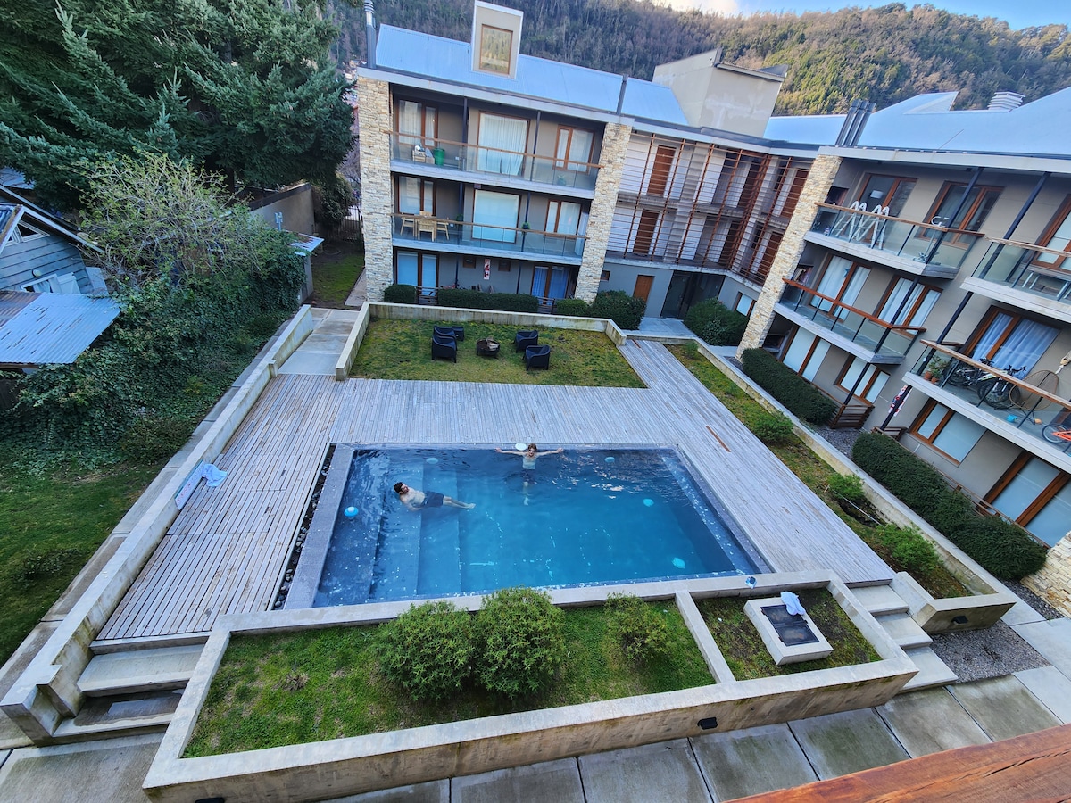 Bellissimo appartamento, spazioso e luminoso, ha una piscina a temperatura ambiente. Situato a 300 metri da Plaza Sarmiento e a 400 metri dalla strada principale di San Martin de los Andes, in Patagonia Argentina. Cucina con attrezzatura super completa, bagno con vasca, salone, 2 sommier individuali a cui si può unire realizzando un letto matrimoniale (doppio insieme), biancheria, Smart TV e WIFI. Nell'edificio: piscina, palestra, sauna, solarium con grill e lavanderia (questi ultimi 2 con costo aggiuntivo)