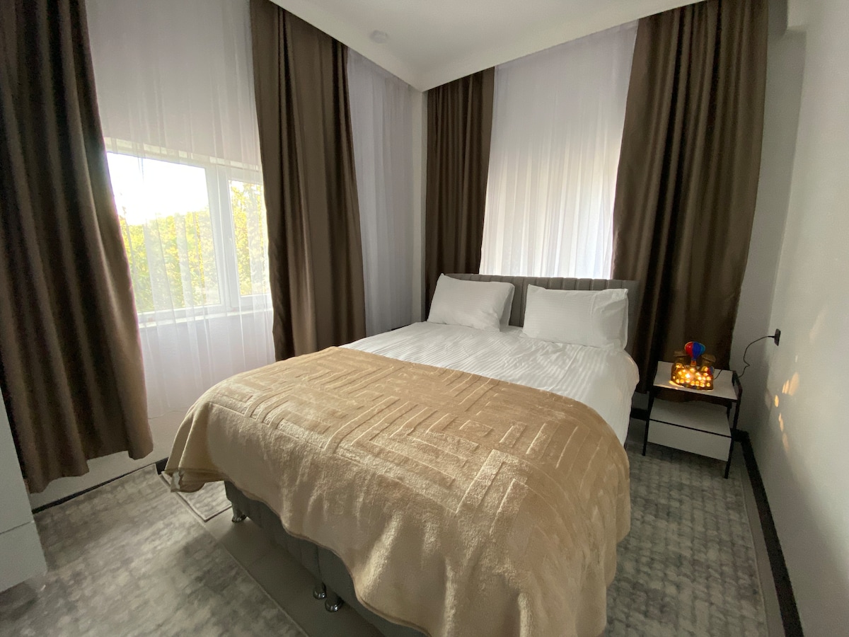 Vivi un soggiorno indimenticabile nella nostra casa in pietra situata a Ortahisar, nel cuore della Cappadocia. I divani del soggiorno si trasformano in un letto e possono ospitare fino a 8 persone; se siete più di 6, avvisateci tramite SMS. L'alloggio offre 3 camere da letto, 2 bagni e una vasca idromassaggio. Trova la pace nel nostro ampio giardino con vista sul castello e su Erciyes. La persona che ha prenotato l'intera casa la utilizzerà.