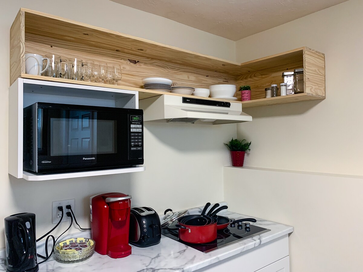 Questo moderno appartamento ospita una camera da letto, un soggiorno e un bagno È MOLTO pulito, con camere ampie Non sono ammessi animali domestici. Ha un proprio ingresso privato Vasca idromassaggio privata con splendida vista Terrazza con barbecue/area salotto Sono disponibili frigorifero con congelatore, tostapane, forno a microonde, macchina Keurig con tazze Keurig, posate, piatti e condimenti A 3 km da un campo da golf panoramico A 1-3 km da spiagge panoramiche e dalla città NESSUNA CUCINA o lavello (lava io i tuoi piatti :)