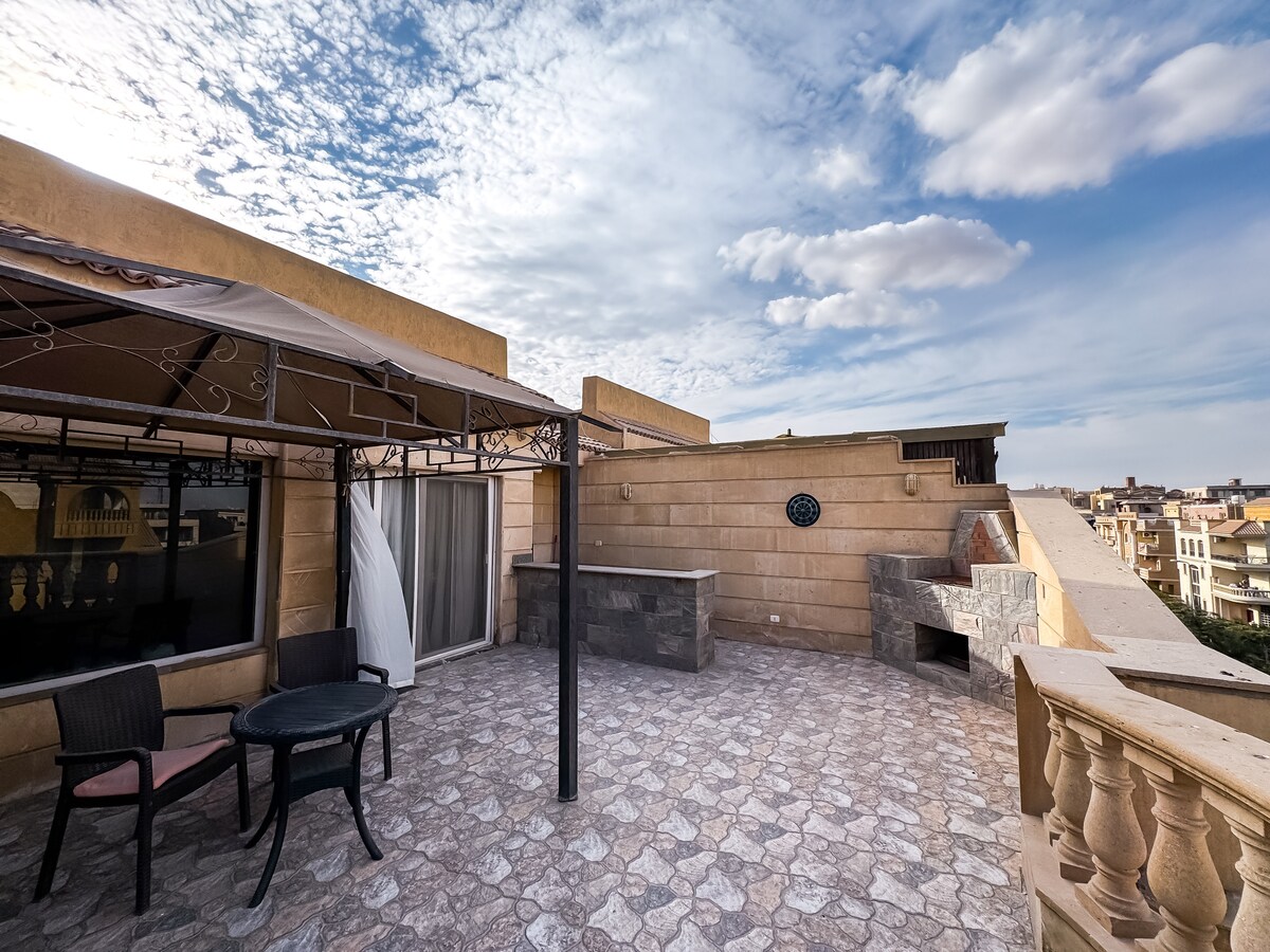 ✨ Experience luxury living in the heart of New Cairo! This elegant 2-bedroom apartment combines modern comfort with stylish design. The open-plan reception features plush recliners, a fully equipped kitchen, and a sun-lit dining area perfect for shared meals. Both master bedrooms offer king beds, ample storage, and cozy touches for restful nights. Step out to your private rooftop garden terrace with sweeping city views, an oasis for yoga, reading, or morning coffee.