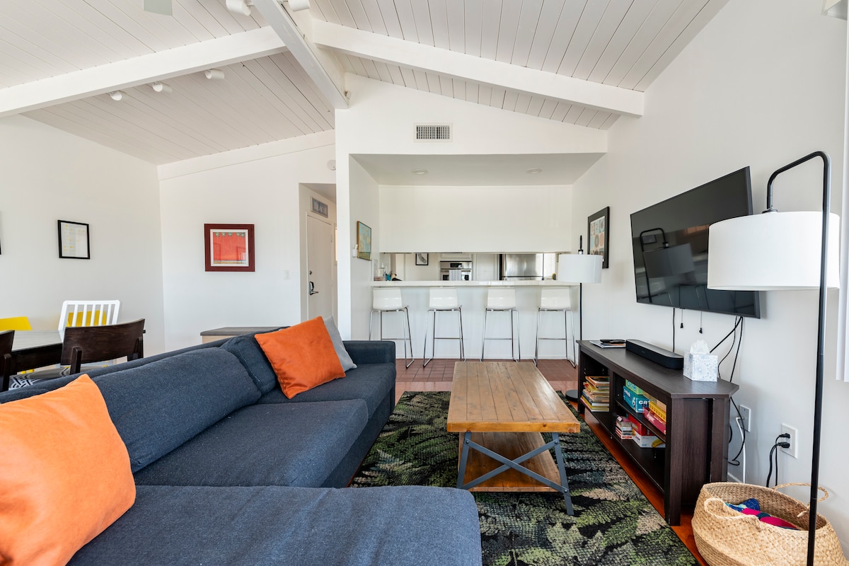 Il secondo piano privato della nostra casa (viviamo al piano di sotto); completamente ristrutturato. Questa è una classica casa sulla spiaggia degli anni '60 con finestre, porte, pavimenti, cucina, bagni, vernice, arredi, elettrodomestici, qualsiasi cosa. Siamo super orgogliosi dell'aspetto finito e sappiamo che sarà una meravigliosa casa lontano da casa! Lo stile è un mix eclettico tra il beachy mid-century e il massimalismo (leggi: DIVERTENTE). Devi avere 25 anni per prenotare. Non prenotare questo per i tuoi figli. Gestito dal proprietario con cura dei dettagli.