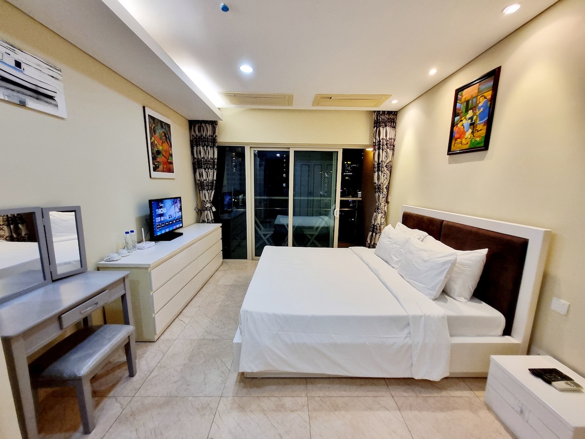 Questo elegante monolocale ai piani alti a Panorama Nha Trang offre una combinazione perfetta di comfort e comodità moderne. Le finestre a tutta altezza incorniciano ampie viste sulla città direttamente dal tuo letto king-size con lenzuola premium a 5 stelle. La spaziosa disposizione include un'ampia scrivania, una Smart TV da 43" e un ampio bagno ben attrezzato. Che tu sia qui per lavoro o per piacere, godrai di un rifugio sereno nel cuore di Nha Trang, a pochi passi dalla spiaggia, dai ristoranti e dai luoghi di intrattenimento.