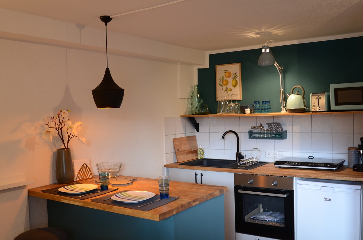 Questo accogliente appartamento di circa 37 metri quadrati è stato ristrutturato con amore e molti materiali da costruzione naturali, in modo che il fascino che una casa così antica può emanare non vada perso. Offre agli ospiti un ambiente molto accogliente in un idilliaco giardino paradisiaco. Proprio di fronte alla casa ci sono posti auto gratuiti a disposizione degli ospiti. È inoltre possibile noleggiare biciclette. Nelle immediate vicinanze ci sono vari negozi raggiungibili a piedi.